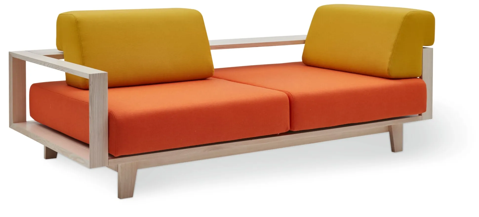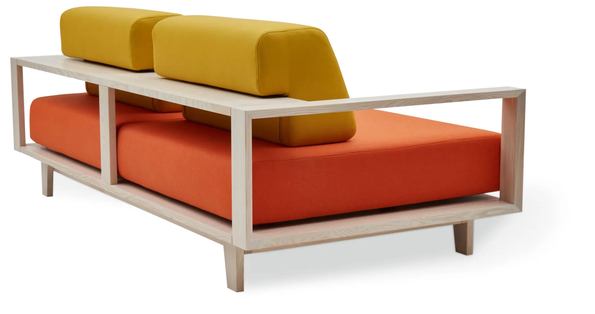 Die Idee, separate Polsterelemente als Sitz und Rückenlehne erdacht in einem Holzrahmen zu platzieren, ist bekannt. Neu hingegen ist diese Art der Gestaltung des raumdefinierenden Holzrahmens, der zum einen die Polster in verschiedenen Positionen aufnimmt und zum anderen unterschiedlich breite Ablageflächen für Arbeit und Alltagsleben bietet. Laptop, Leuchte, Weinglas finden selbstverständlich ihren Platz auf dem Sofa. Und so schafft WOOD Raum für Sitzen und Entspannen, Arbeiten und Lesen und sogar zum Schlafen. Denn ist das Rückenkissen entfernt, ergibt sich eine Liegefläche von 109 x 200 cm.