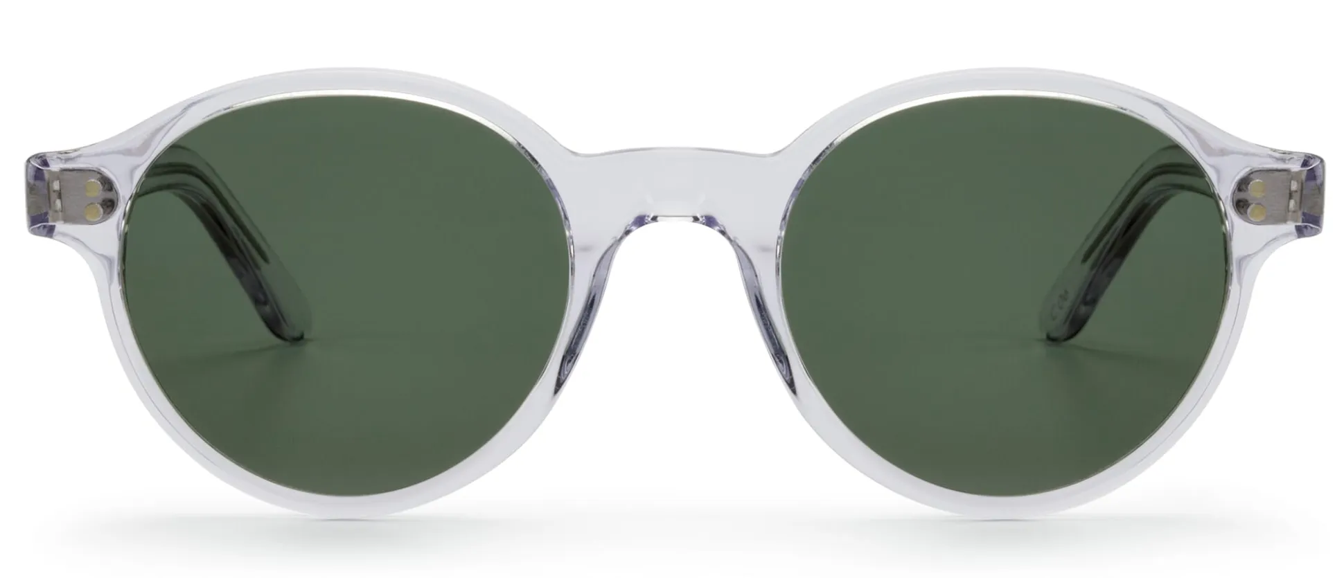 Optisch nimmt sich das klare, von Modellen der 1980er Jahre inspirierte Azetatgestell dieser Sonnenbrille deutlich zurück. Ins Auge fallen vielmehr die ins Grünliche gehenden Kunststoffgläser der Kategorie 3. Durch ihren starken Tönungsgrad schützen sie in fast allen Situationen vor Blendung, selbst auf Wasseroberflächen, am Strand oder in den Bergen.