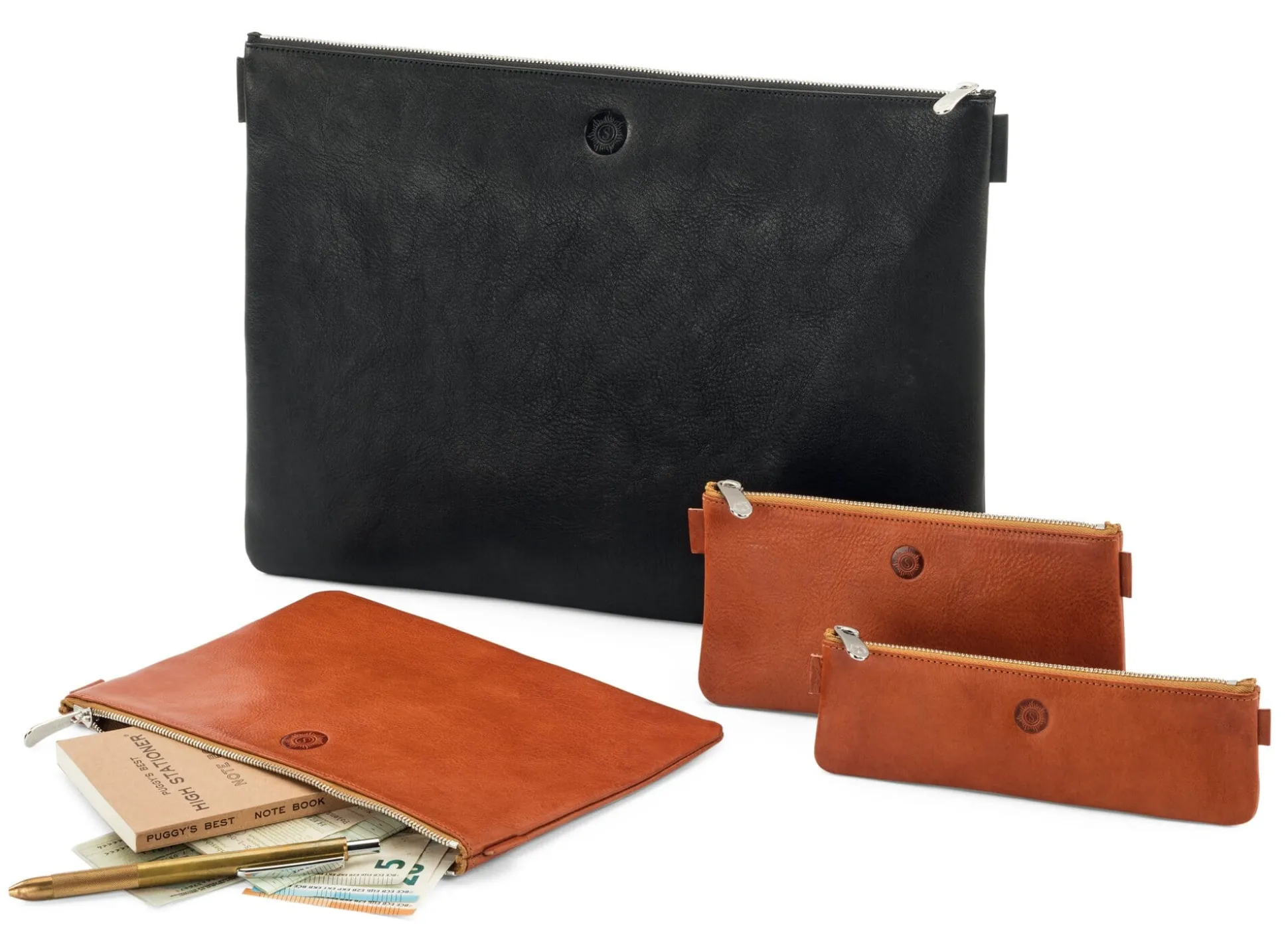 Zwecks Aufbewahrung und Transport nützlicher Alltagsutensilien bieten wir seit geraumer Zeit klassische Banktaschen von Sonnenleder an, nun stellen wir ihnen auch Mappen anderer Formate zur Seite. Die kleinste der geschmeidigen wie strapazierbaren Hüllen aus grubengegerbtem Rindleder – wir nennen sie Federtasche – kann Schreibgeräte, Kosmetika oder sonstige kleinere Gegenstände vorhalten, die Utensilientasche bietet ausreichend Platz für ein Mobiltelefon oder das Portemonnaie. Die uns bekannte Banktasche eignet sich zum Transport von Notizbüchern oder als Kulturbeutel, die üppiger angelegte Dokumententasche vermag sogar Papiere bis zum Format A4 aufzunehmen.