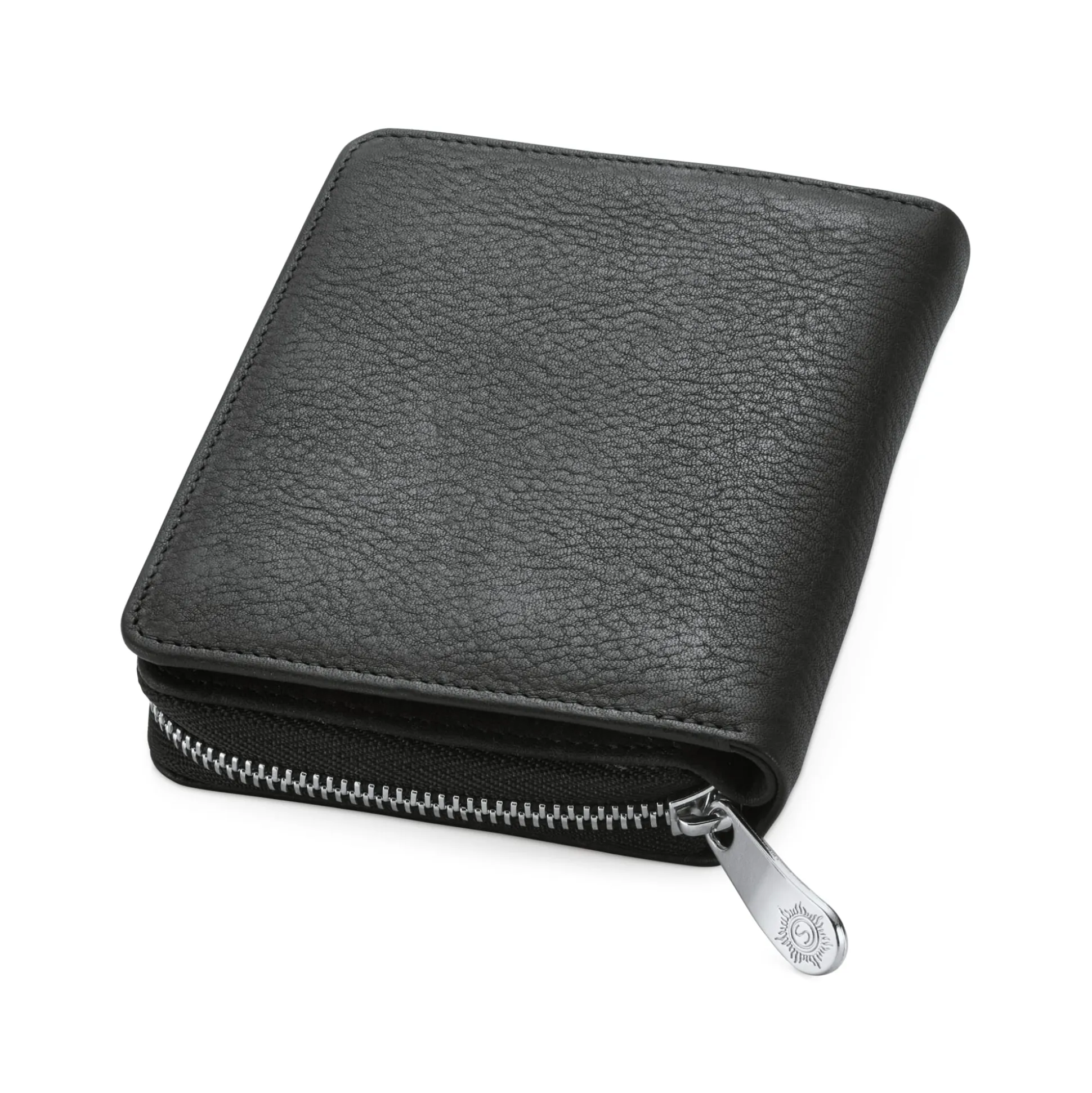 Eine kompakte, handliche Geldbörse, deren über drei Seiten laufender Reißverschluss zwei Münzfächer birgt. Die beiden Geldscheinfächer, sechs Kreditkartenfächer sowie zwei Steckfächer sind mittels Druckknopf zu schließen.