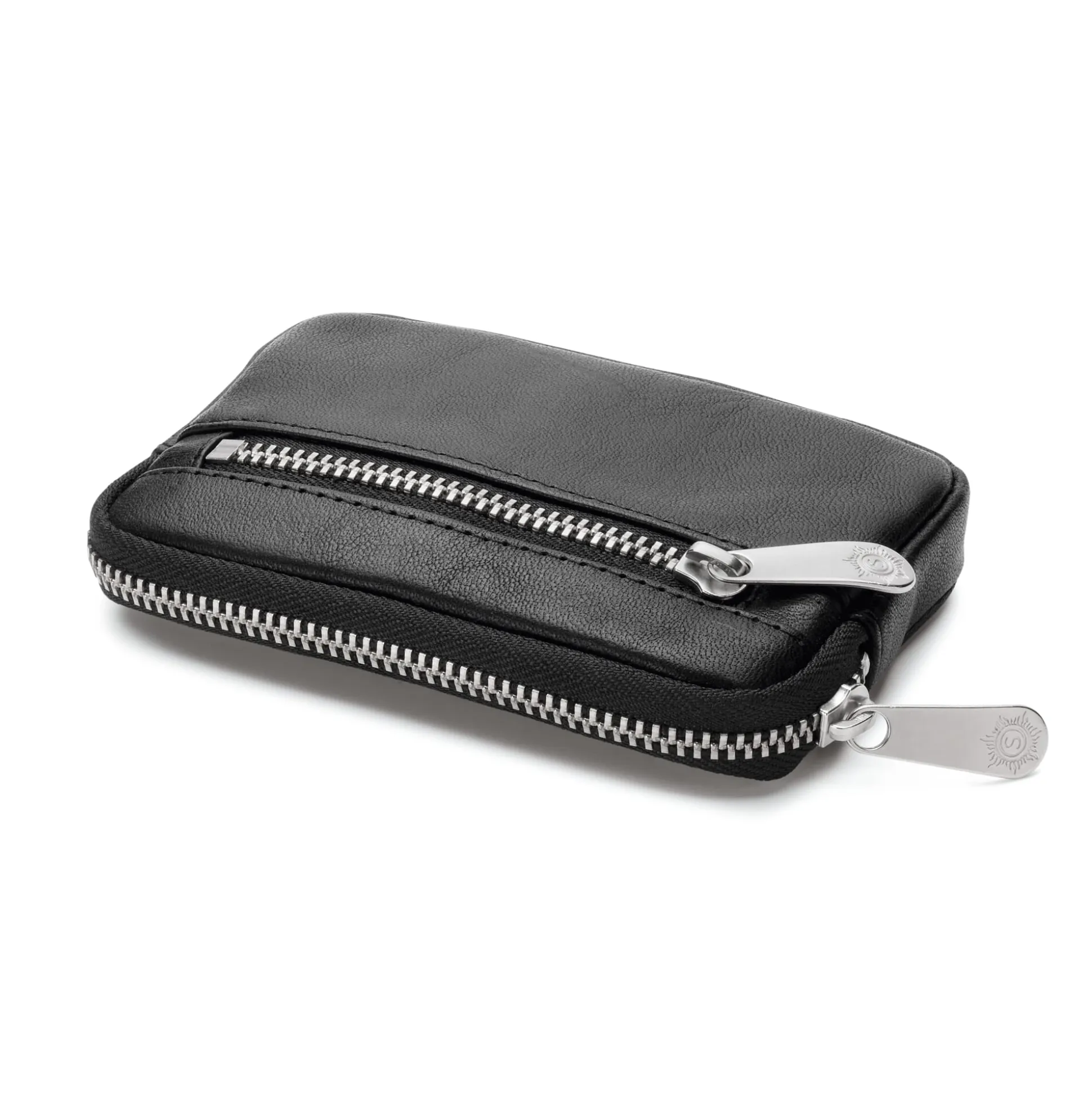 Bei diesem großen, praktischen Etui für Schlüssel ist der Reißverschluss beidseits ein Stück um die Ecken geführt und ermöglicht ein weites Öffnen. An der Vorderseite befindet sich ein Geldfach mit Reißverschluss. Beide Schlüsselringe (Ø 2,7 cm) sind jeweils an einem Lederbändchen befestigt. Ohne sichtbare Nähte an den Außenkanten.
