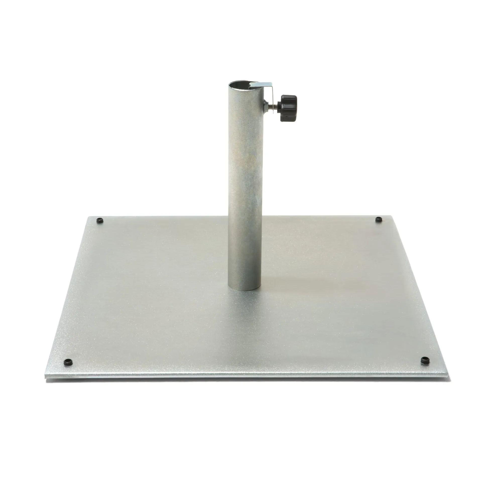 Standfester Sonnenschirmständer, mit extra flacher und somit wenig im Weg stehender Standplatte. Vier Stopfen zum Schutz hochwertiger Böden sind im Lieferumfang enthalten. Der Regenwasserabfluss erfolgt durch das Standrohr. Der Schirmständer fasst Schirmmasten bis 4,4 cm Durchmesser.