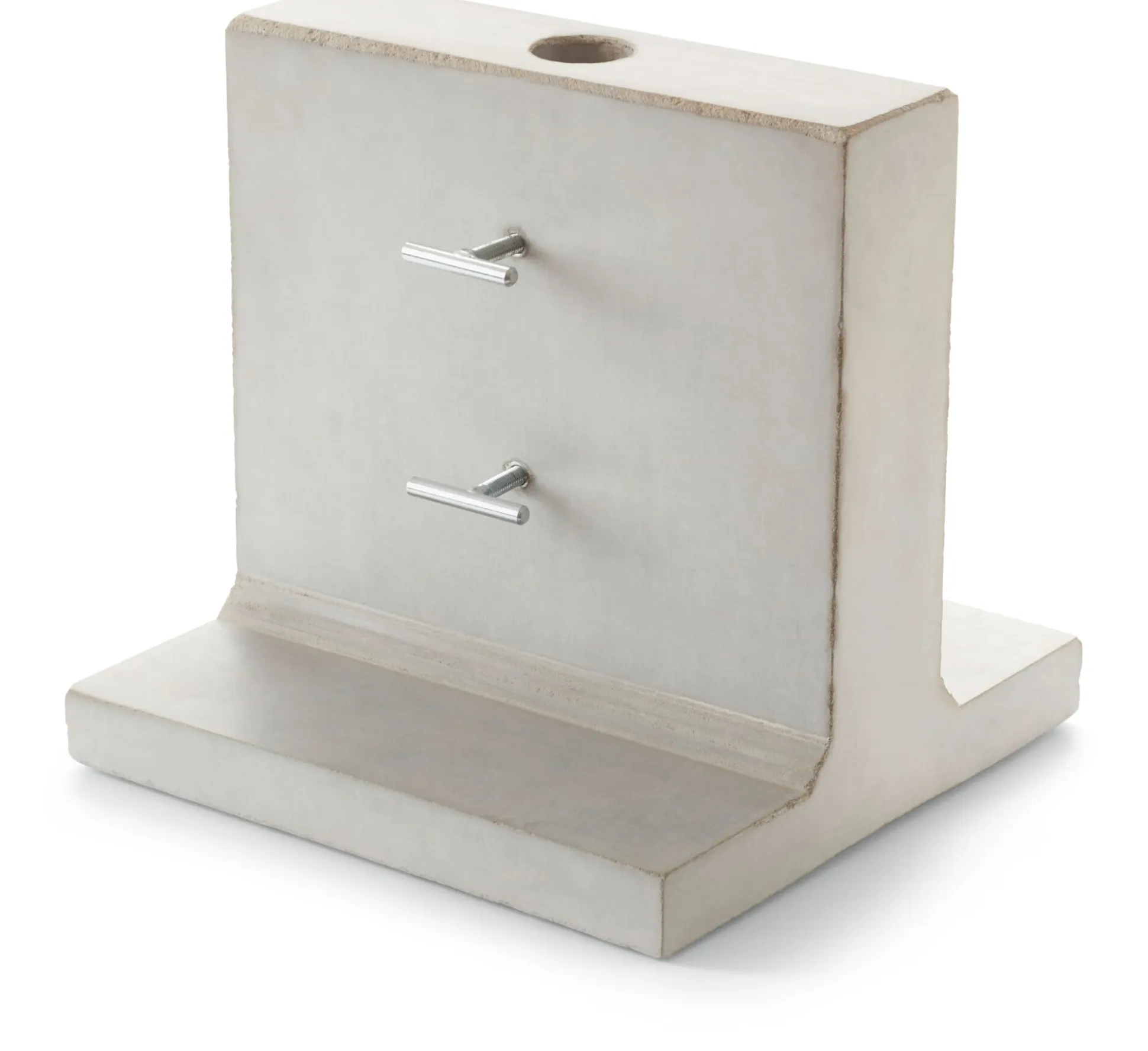 Dieser formal eigenständige Sonnenschirmständer aus gegossenem Feinbeton nutzt die von Stahlträgern für ihre Belastbarkeit bekannte T-Form, um Sonnenschirme sicher aufzunehmen und stabil zu halten. Für die einfache Handhabung sorgen zwei ebenfalls T-förmige Flügelschrauben: Sie fixieren Schirmrohre mit einem Durchmesse von bis zu 4 cm sicher im zylindrischen Schaft. Mit einem Gewicht von 21, 5 kg und versehen mit einer Wachsschicht, hält der Schirmständer Wind und Regen stand.