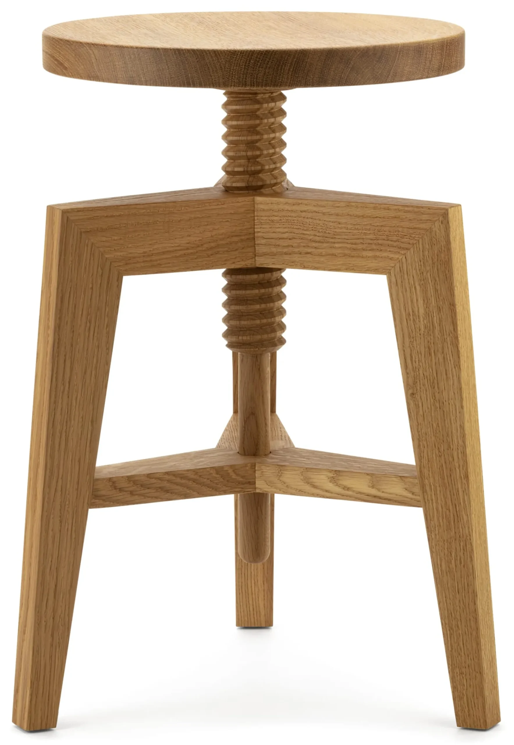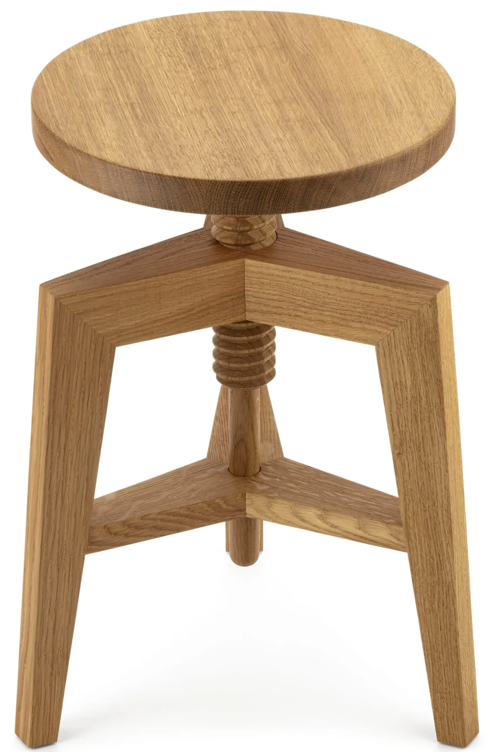 Von Haus aus, noch besser gesagt, von Werkstatt aus sind Spindelhocker Arbeitsmöbel, die einen exakt umrissenen Zweck erfüllen: mit flexibel einstellbarer Sitzhöhe Nutzer*innen Überblick bei der Arbeit zu verschaffen – an jedem Tisch, für jede Körpergröße. Die einfache, doch höchst funktionale technische Lösung für diese Anforderung ist die mechanische Höhenverstellung über eine Gewindespindel. Die formale Gestaltung eines solchen Hockers folgt ebenfalls allein diesem Zweck und beschränkt sich auf das Notwendige: das vom Dreibeinschemel inspirierte Gestell, eine Spindel, eine Sitzfläche – Minimalismus vom Feinsten. Wie aus dem ursprünglichen Werkstattmöbel ein eindrucksvolles, hochmodernes Wohnmöbel mit innenarchitektonischem Mehrwert werden kann, sehen wir an diesem Beispiel: Bis in sein zentrales Element hinein ist der Spindelhocker vollständig aus massivem heimischem Eichenholz gefertigt.