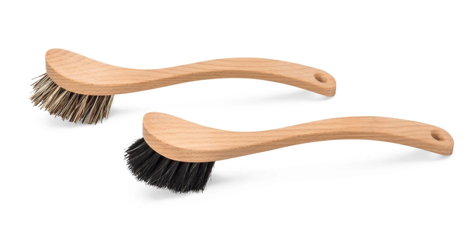 Anders als ihre gänzlich auf Funktion ausgelegten Kolleginnen zeigt sich diese Spülbürste aus geöltem Buchenholz in geradezu schwungvoll-eleganter Form – der deutsche Hersteller nennt sie intern auch Schwanenhalsbürste. Sie macht aber nicht nur optisch, sondern auch in der Anwendung eine gute Figur. Der Bürstenkopf ist etwas schlanker und gelangt so besser durch Glas- und Flaschenöffnungen. Ihre leicht ausgestellten Borsten kommen gut in Ecken und reinigen auch dort gründlich.