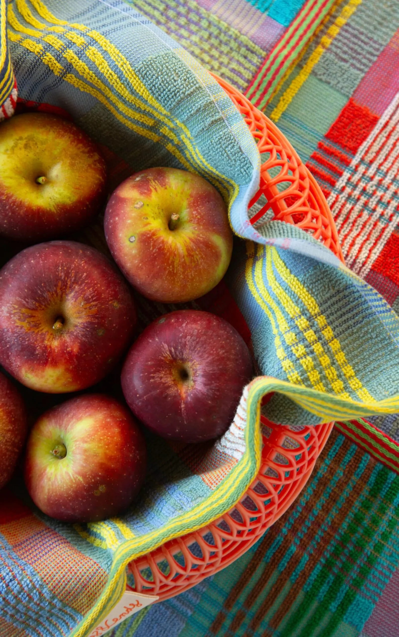 Wenn Fabriken Garne einfärben, um daraus Textilien zu weben, wird oftmals mehr Garn produziert als benötigt wird – für alle Fälle. Es bleiben also regelmäßig erhebliche Mengen Garn übrig, die im Normalfall entsorgt werden. Für die Textilien der Kollektion Odds & Ends sammelt Foekje Fleur ebendiese Garnreste – ausschließlich Baumwollgarne – und produziert daraus Heimtextilien. Geschirrtücher, Spültücher, Waschhandschuhe und Duschtücher in zuvor festgelegten komplexen, grafischen Mustern aus sich überlagernden und kreuzenden Linien in unterschiedlichen Farben und Stärken. Ihre Farbgebung entsteht in Abhängigkeit von den verfügbaren Garnen. Und zwar in Chargen: Nach Sichtung der vorhandenen Garne stellt die niederländische Designerin die auffälligen und fein austarierten Farbkombinationen für die nächste Charge der Kollektion zusammen. Gehen die Garne aus, werden einzelne Farben ersetzt oder eine ganz neue Kombination gestaltet. Kleine Abweichungen in der Farbgebung innerhalb einer Charge sind also eingeplant, leichte Größenunterschiede fertigungsbedingt ebenfalls.
