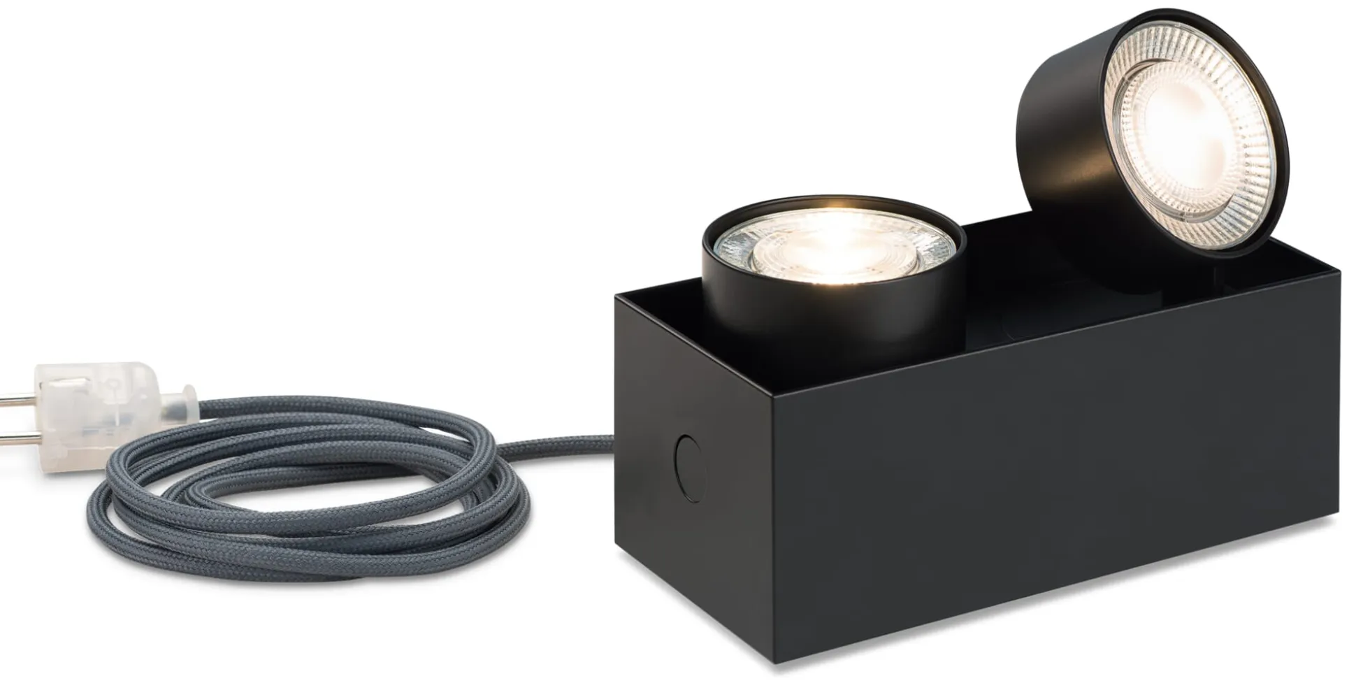 Hier wird der Decken- und Wandaufbaustrahler zur aufstellbaren Einzelleuchte. Der Strahlertyp DRUFF leistet überall dort seinen Dienst, wo von unten wirkende Akzentbeleuchtung gewünscht ist, oder einfach dort, wo die Stromzufuhr nicht über Wand- oder Deckenauslässe gewährleistet ist. DRUFF steht auf dem Boden, oben auf dem Sideboard oder im Regal. Aufwendiges Gehäuse, schön gefertigt, ohne sichtbare Schrauben und Kabel. Die um 365 Grad drehbaren und 90 Grad zu schwenkenden Strahlerköpfe sitzen leicht versenkt auf dem rechteckigen Gehäuse auf. Mit einem Griff lässt sich der gesamte Lichtkopf dank eines patentierten Bajonetts zur Wartung vom Gehäuse lösen. Der Lichtaustrittswinkel der Leuchtmittel liegt bei 12 Grad und erzeugt damit ein punktuelles Licht. Im Lieferumfang enthalten sind zwei Aufsatzlinsen, deren Einsatz einen Lichtausfall von 38 Grad erzeugt und die somit breit abstrahlen. Kabel: L 230 cm, Schutzkontaktstecker (Typ F) . Die Leuchte enthält LED-Lampen. Lichtstrom: 1.100 lm, Farbtemperatur: 2.700 K, Farbwiedergabe (CRI > 90), Nennleistung: 2 x 12,7 W. Tauschbare Wechseloptiken mit 12° und 38° Abstrahlwinkel.