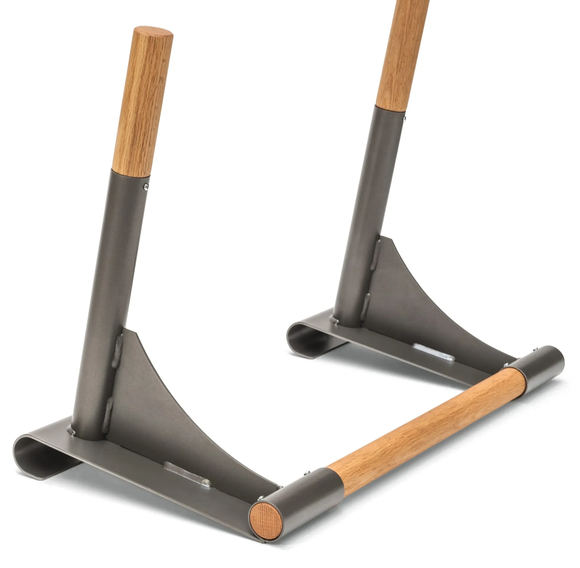 Holme unbehandeltes Eichenholz (Herkunft Deutschland), Ø 3,5 cm. Halterung Stahl pulverbeschichtet. Hergestellt in Deutschland. L 70 × B 50 × H 34 cm. Gewicht 5,5 kg. Max. Belastung 120 kg.