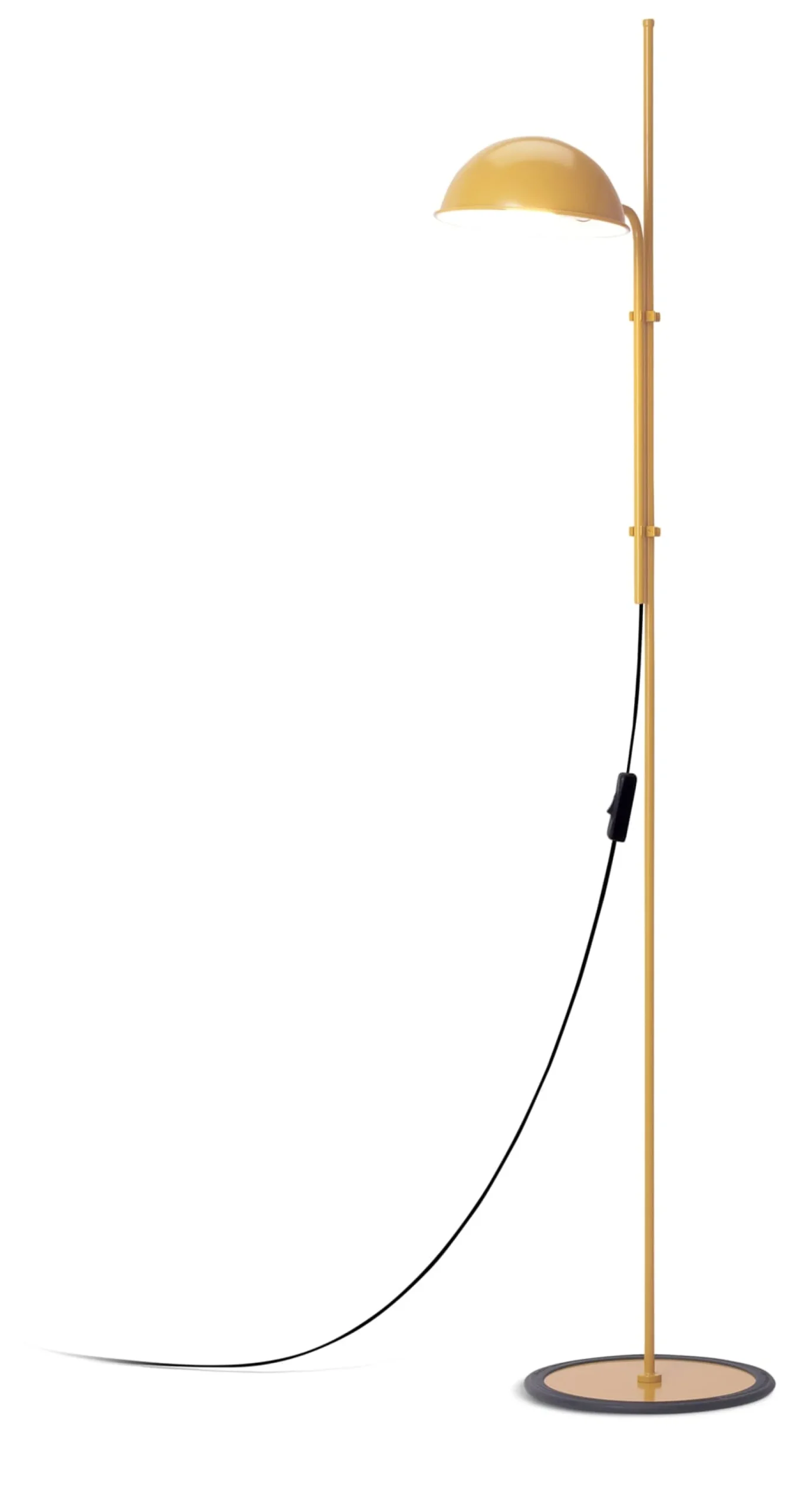 Schafft mit ihrem Reflektor in Form eines Kugelausschnitts schöne Lichtinseln: Die Leuchte FUNICULI besticht in ihrer Einfachheit und ihrem Effekt. Die beiden parallel laufenden Stäbe des Stativs lassen sich gegeneinander verstellen und regulieren so die Höhe der Leuchten. Der um die Standardfassung platzierte, halbkugelförmige Schirm ist um 360 Grad dreh- und somit nach allen Seiten orientierbar. Zum Schutz der Oberflächen am Standort trägt die Fußplatte einen breiten Gummiring.
