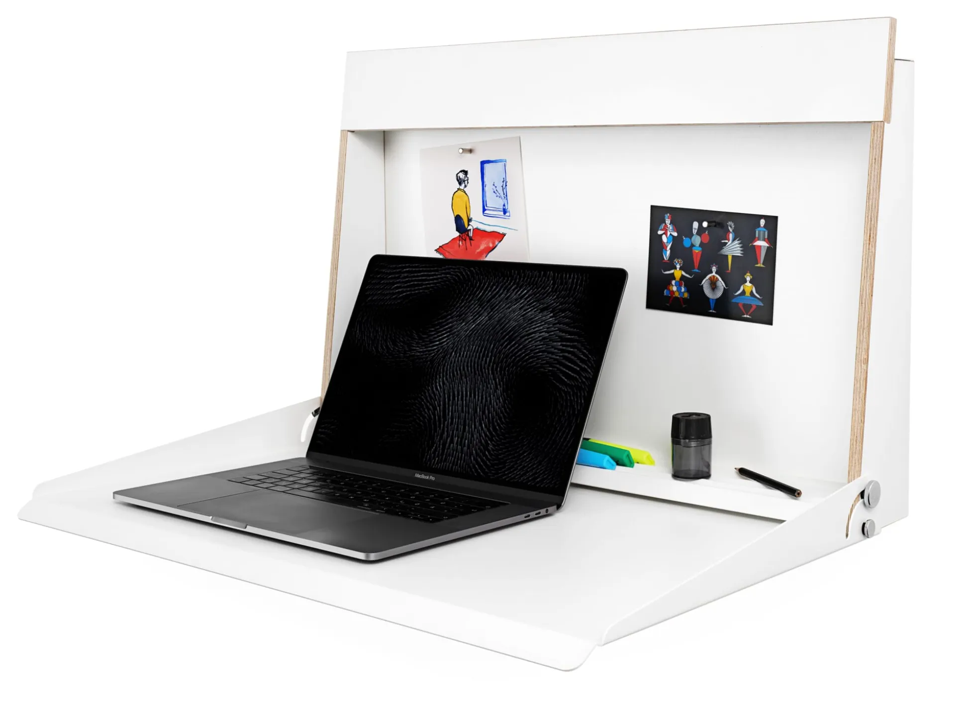 Als Stehpult oder als Wandsekretär: KABINETT ist ein schlankes Möbel mit funktionalem Innenraum und kleiner Arbeitsfläche. Überall dort einsetzbar, wo der Steharbeitsplatz als Ergänzung zum regulären Arbeitstisch gewünscht wird oder wo für den großen Schreibtisch kein Raum vorhanden ist. Die Wandmontage mit nur drei Schrauben ermöglicht eine individuelle Anbringung auf Steh- oder Sitzhöhe. Aufgeklappt bietet die so entstehende „Mini Workstation“ Raum für einen Laptop oder auch für einen aufgeschlagenen Aktenordner. Geschlossen beansprucht KABINETT mit seiner geringen Tiefe kaum Platz und ist doch ein kleines Raumwunder mit durchdachten Details: So dient die Rückwand aus Stahlblech als Pinnwand und die Zick-Zack-Profilierung des Korpusbodens nicht nur als Ablage für Stifte, sondern auch als Kippsicherung für den hochkant gestellten Laptop, den Tabletrechner oder Papier.