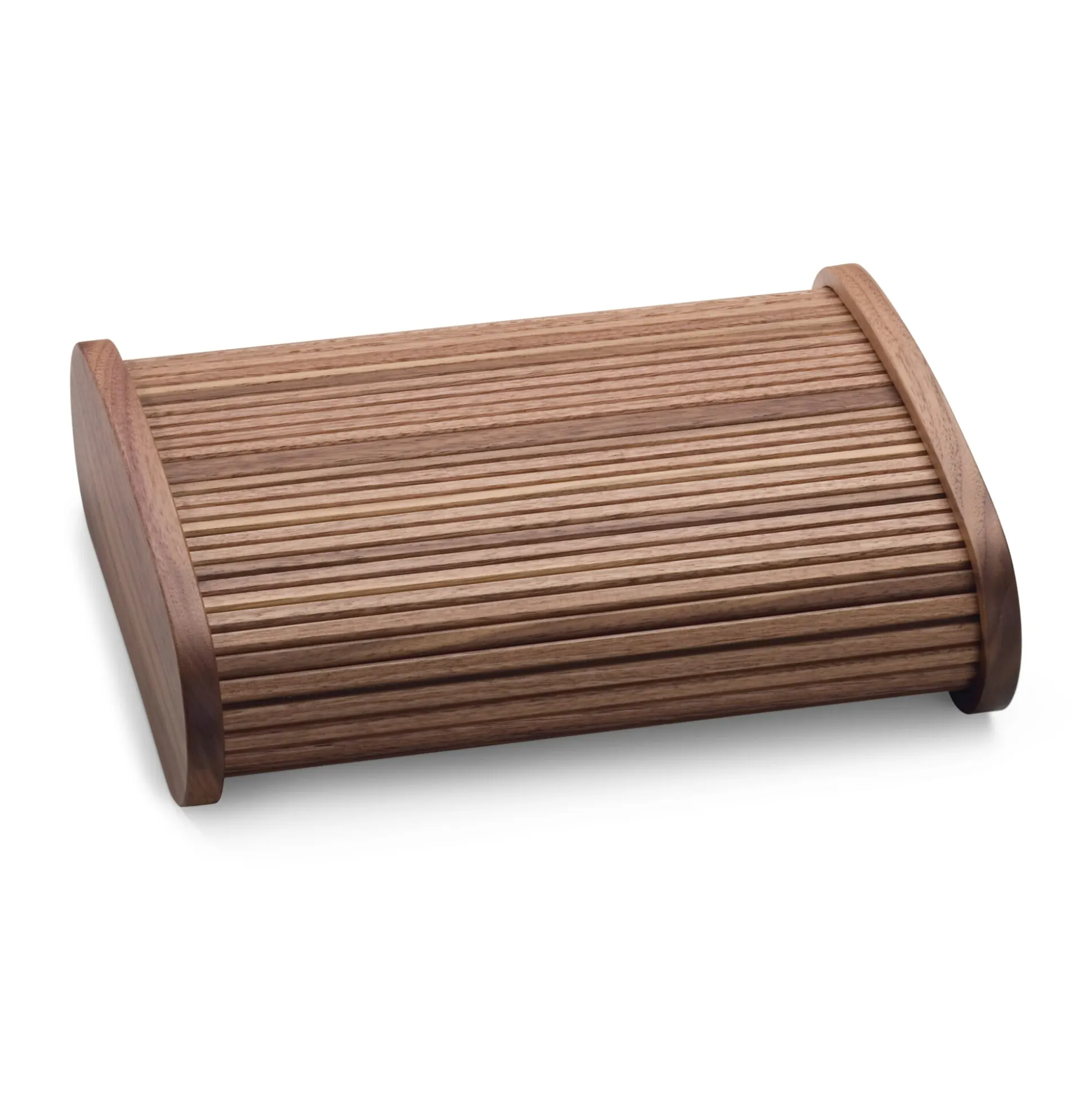 Vollständig aus massivem Nussbaumholz ist diese Stiftablage gemacht. Die gefrästen und sauberst geschliffenen Mulden nehmen Schreibgeräte und Kleinutensilien auf. Der Rollladen wird in einer umlaufenden Nut geführt und einfach mit der flachen Hand bedient. Höhe 7 cm, Breite 24,5 cm, Tiefe 19 cm. Gewicht 520 g. Lieferung ohne Utensilien.