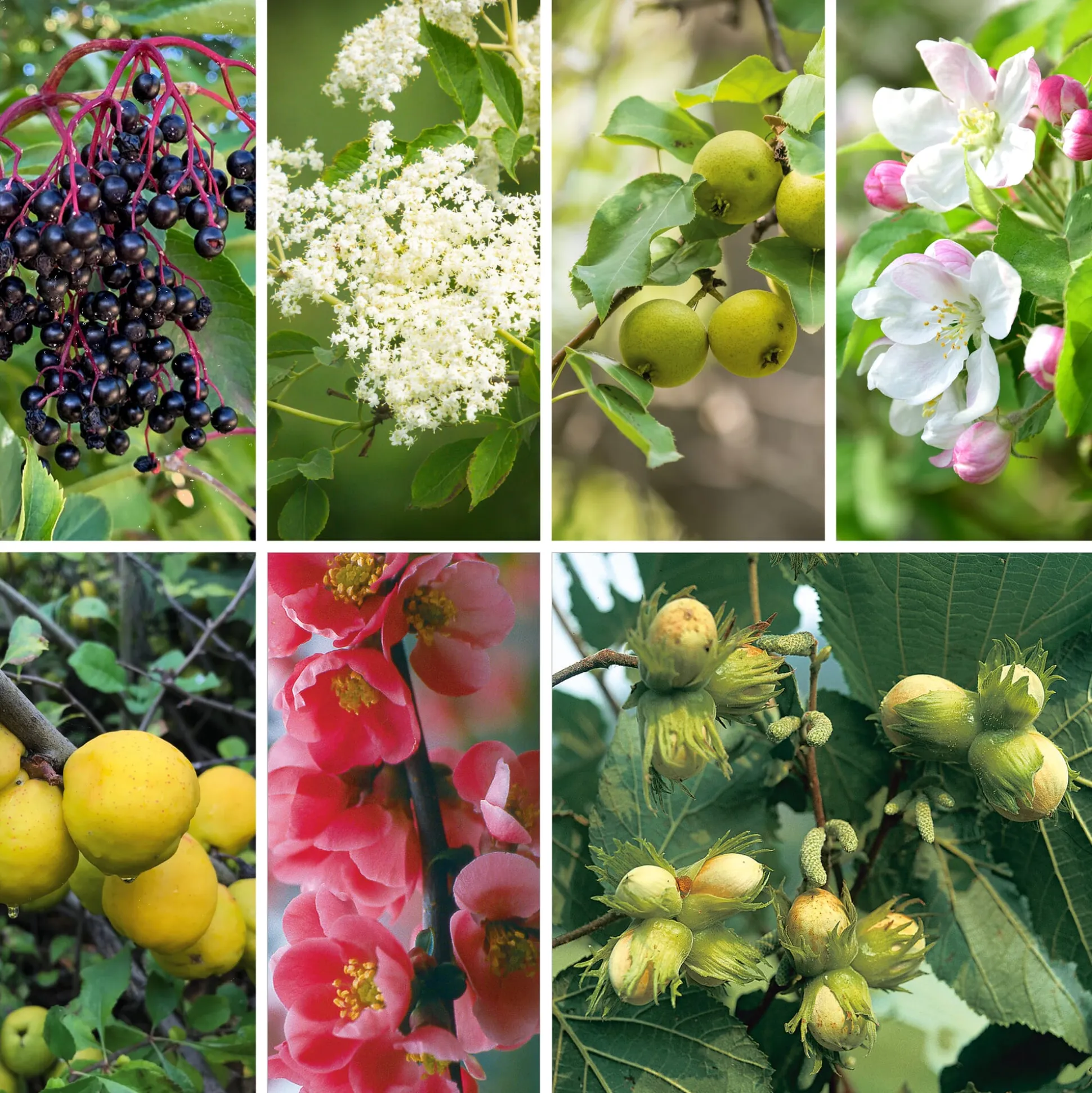 4 Pflanzen, je 1 Holunder, Wildapfel, Scheinquitte und Haselnuss.