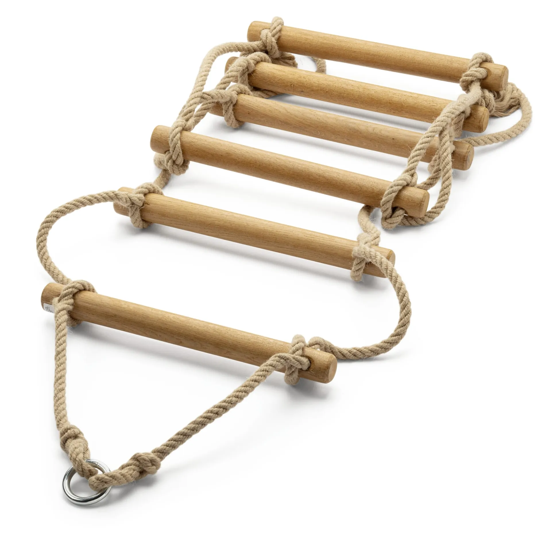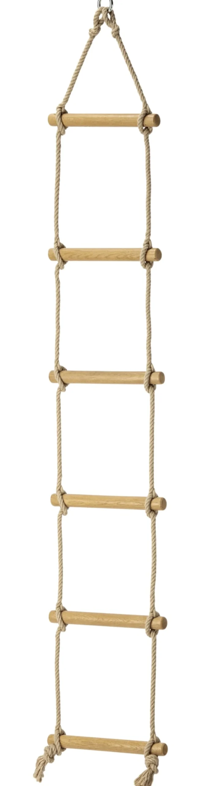 Seile aus PP-Spinnfaser. 6 Sprossen aus massivem Eichenholz (Ø 3,5 cm, Breite 36 cm). Schaukelring aus Stahl, Ø 5,5 cm. Gesamtlänge 2 m. Maximales Belastungsgewicht 75 kg. Gewicht 1,7 kg.
