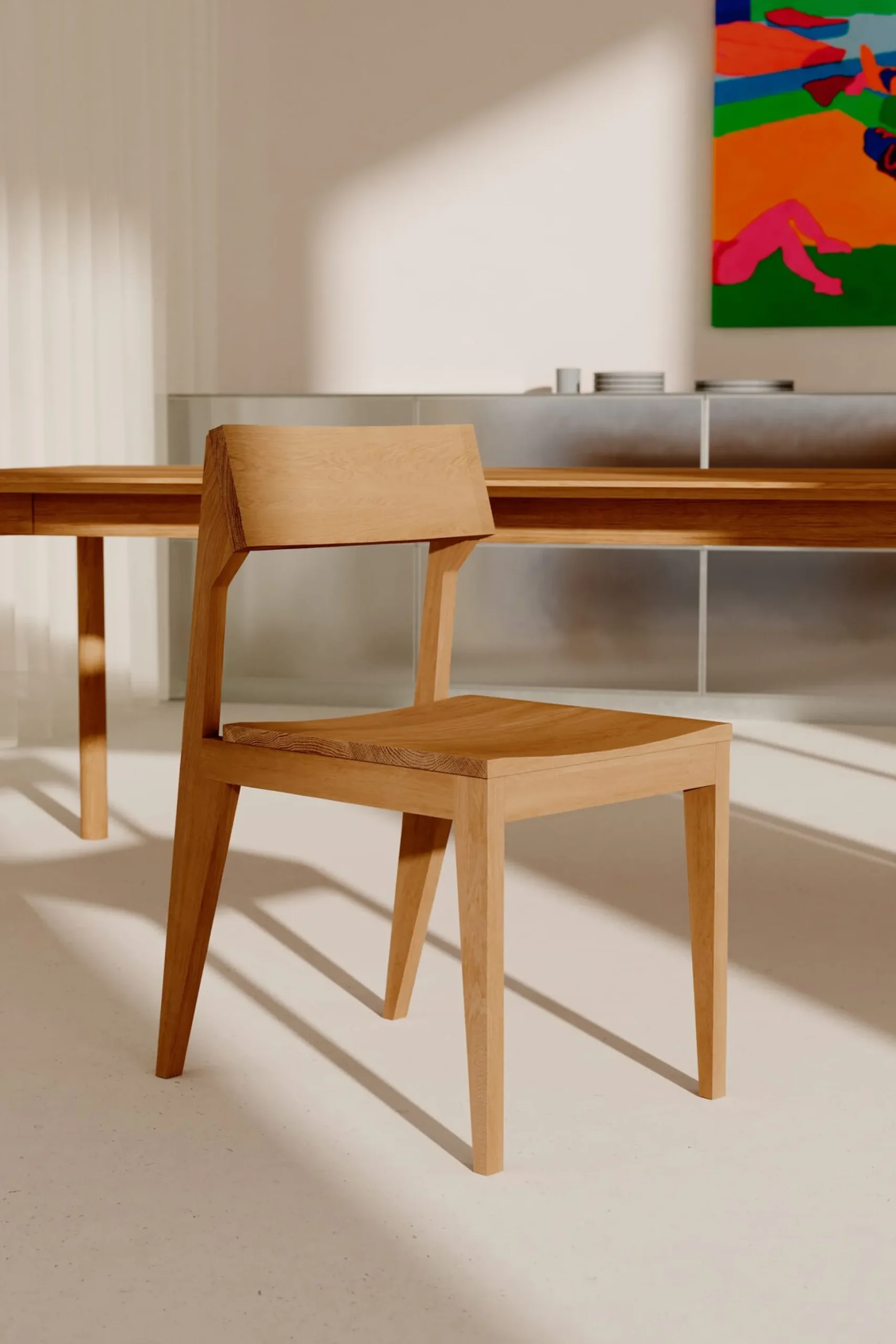 Kantig, grafisch, präzise. Keine Frage – Stuhl SCHULZ ist ein Hingucker. So futuristisch sein Äußeres, so klassisch und durchdacht seine Fertigung sowie der Entwurf dahinter – dieser stammt von Anton Rahlwes. SCHULZ ist nämlich eigentlich ein klassischer Holzstuhl, gefertigt in Deutschland, in traditioneller Handwerkskunst, aus massivem Esche- und Eichenholz. Deutlich sichtbar ist die Holzmaserung unter der hochwertigen Lackierung. Die schräg angestellten Hinterbeine und seine robuste Konstruktion machen den Stuhl ungemein stabil und wappnen ihn für den täglichen Gebrauch – am Esstisch, als Schreibtischstuhl oder als Sitzgelegenheit im Flur.