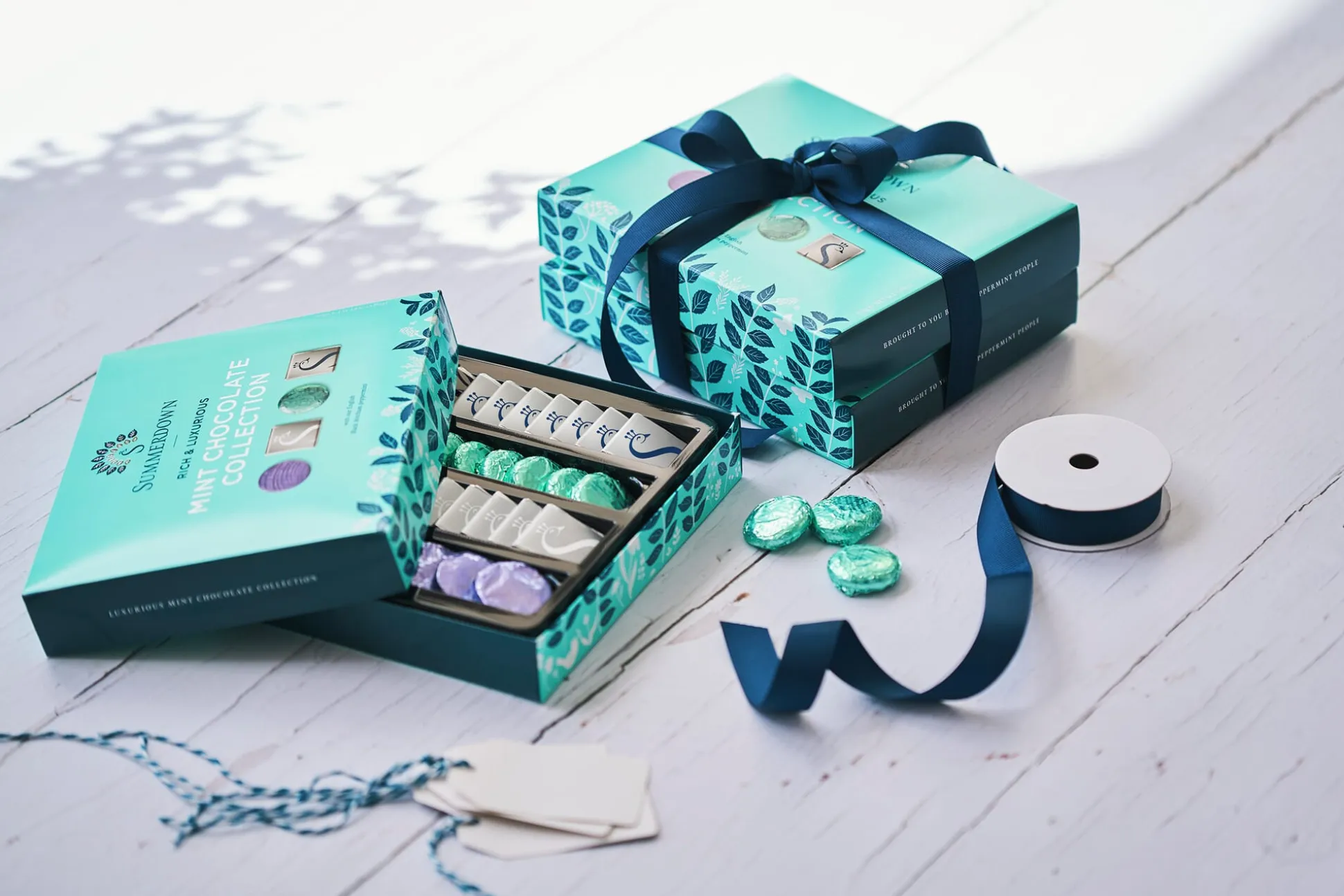 Diese Zusammenstellung ist gewissermaßen die Summerdown-Schatztruhe. Sie enthält eine Auswahl an Schokoladenspezialitäten, die sämtlich vom intensiven Aroma der Black-Mitcham-Minze geprägt sind: Zartbitter-Pfefferminz-Fondanttaler, Zartbitter-Pfefferminz-Knuspertaler und zweierlei Pfefferminz-Neapolitaner – aus Zartbitter- und aus Vollmilchschokolade. Letzteres ist eine gute Alternative für diejenigen, die eine besonders milde, cremige Schokolade bevorzugen.