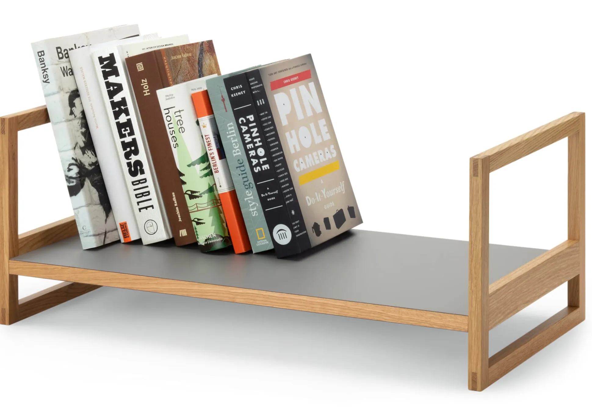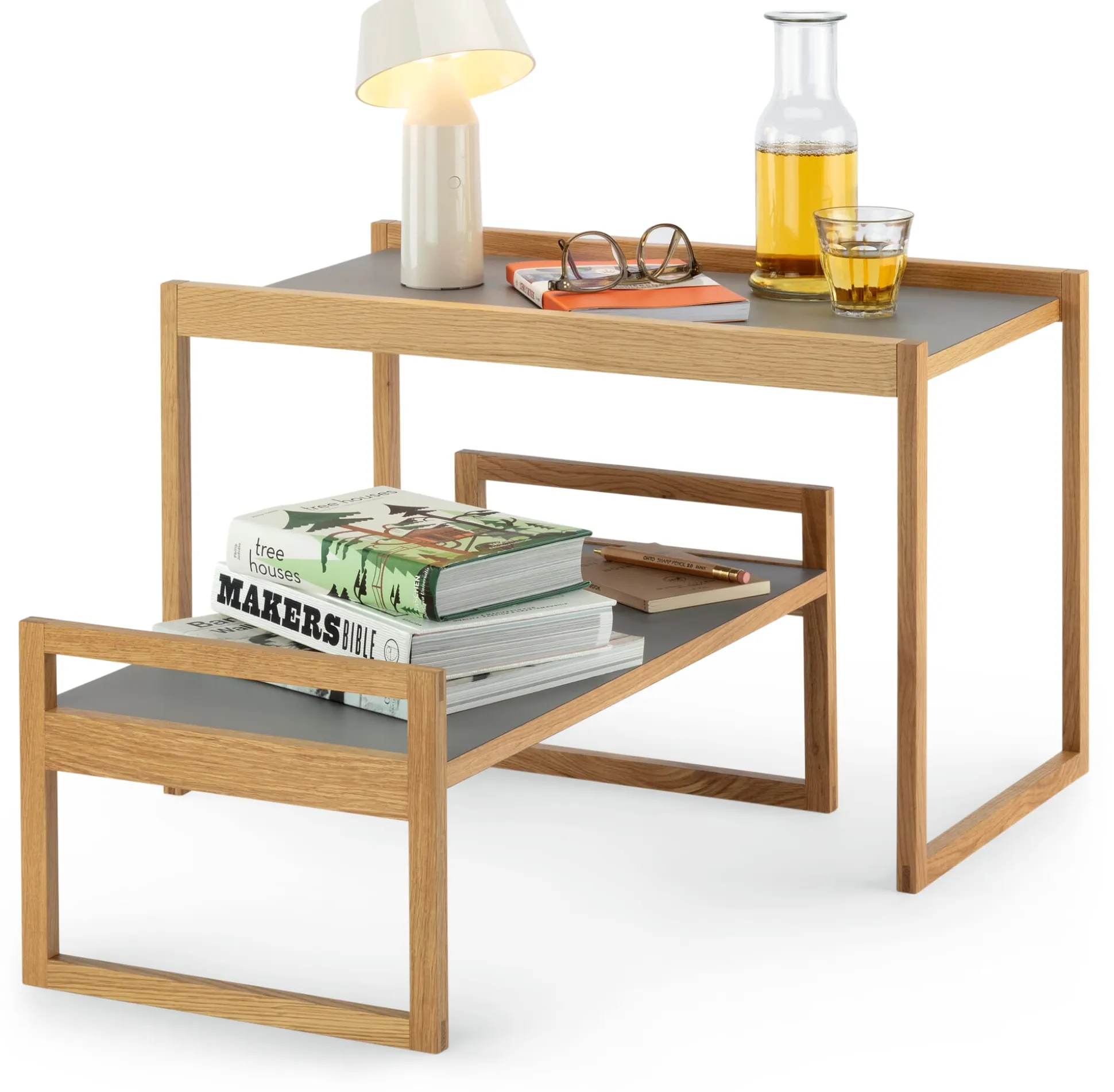 Das kleinere Element ist mehr als nur der zweite Satztisch, der unter den größeren Tisch geschoben werden kann. Vor allem bietet es sich als durables Couch- und Bett-Tablett an: Die kürzeren Seitenwangen etablieren sich als solide Tragegriffe, die längeren Seitenwangen schaffen Stabilität und Standhöhe, um das Tablett auch über Kissen oder Decke zu positionieren. Wer ausgeschlafen ist, der hat darüber hinaus die Möglichkeit, das Tablett-Element nach Art des Schreibtisch-Bücherregals zu verwenden: am Arbeitsplatz oder am Nachttisch, auf der Kommode oder auch einfach neben den Ohrensessel platziert, hält es mit den längeren Seitenwangen zuoberst Lektüre in Griffweite oder Ihr dekoratives Arrangement auf Augenhöhe.