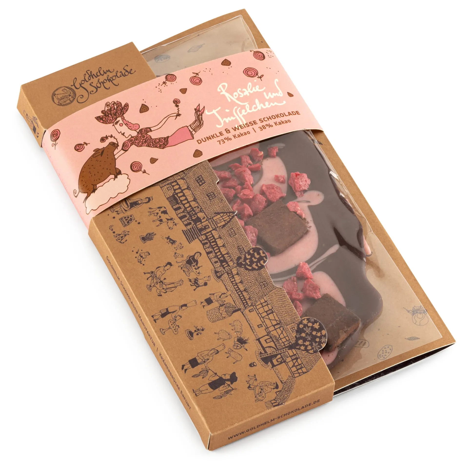 Diese Tafelschokolade kombiniert fruchtige Himbeeren in weißer Schokolade (Rosalie) mit dunkler Grand-Cru-Dschungelschokolade (Trüffelchen). Die Criollo-Kakaobohnen für letztere stammen, wie bei Goldhelm üblich, von der Kooperative Mateo Pumacahua in Peru.
