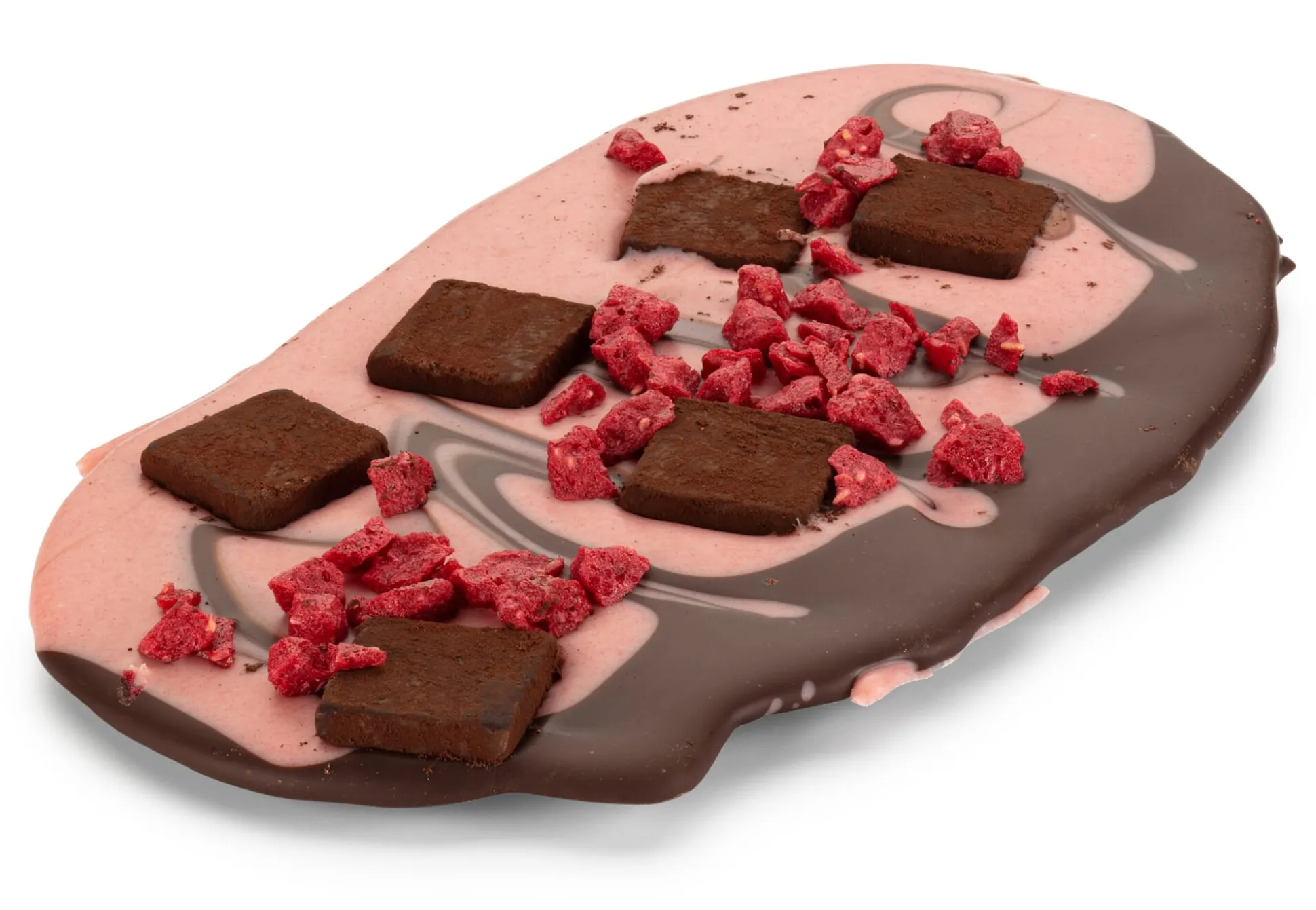 Dunkle und weiße Schokolade (Kakao: 73% mind. / Kakao: 38% mind.) mit Himbeeren und Trüffel