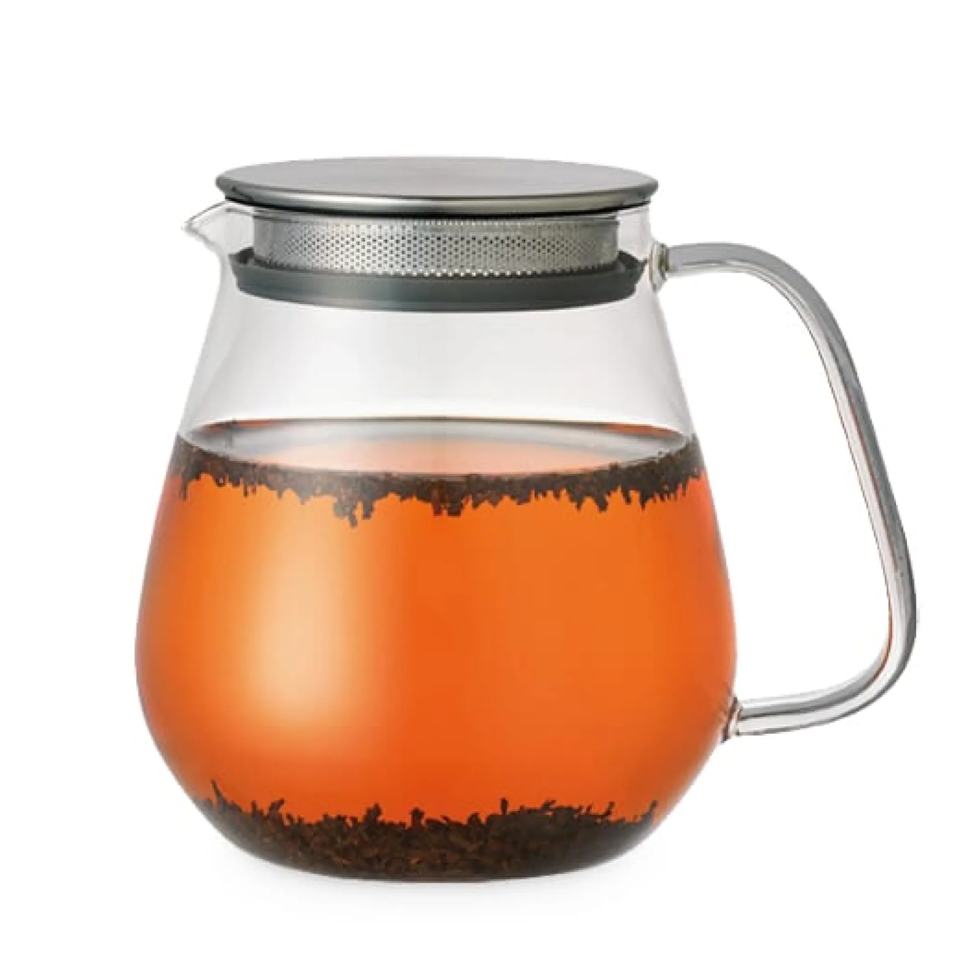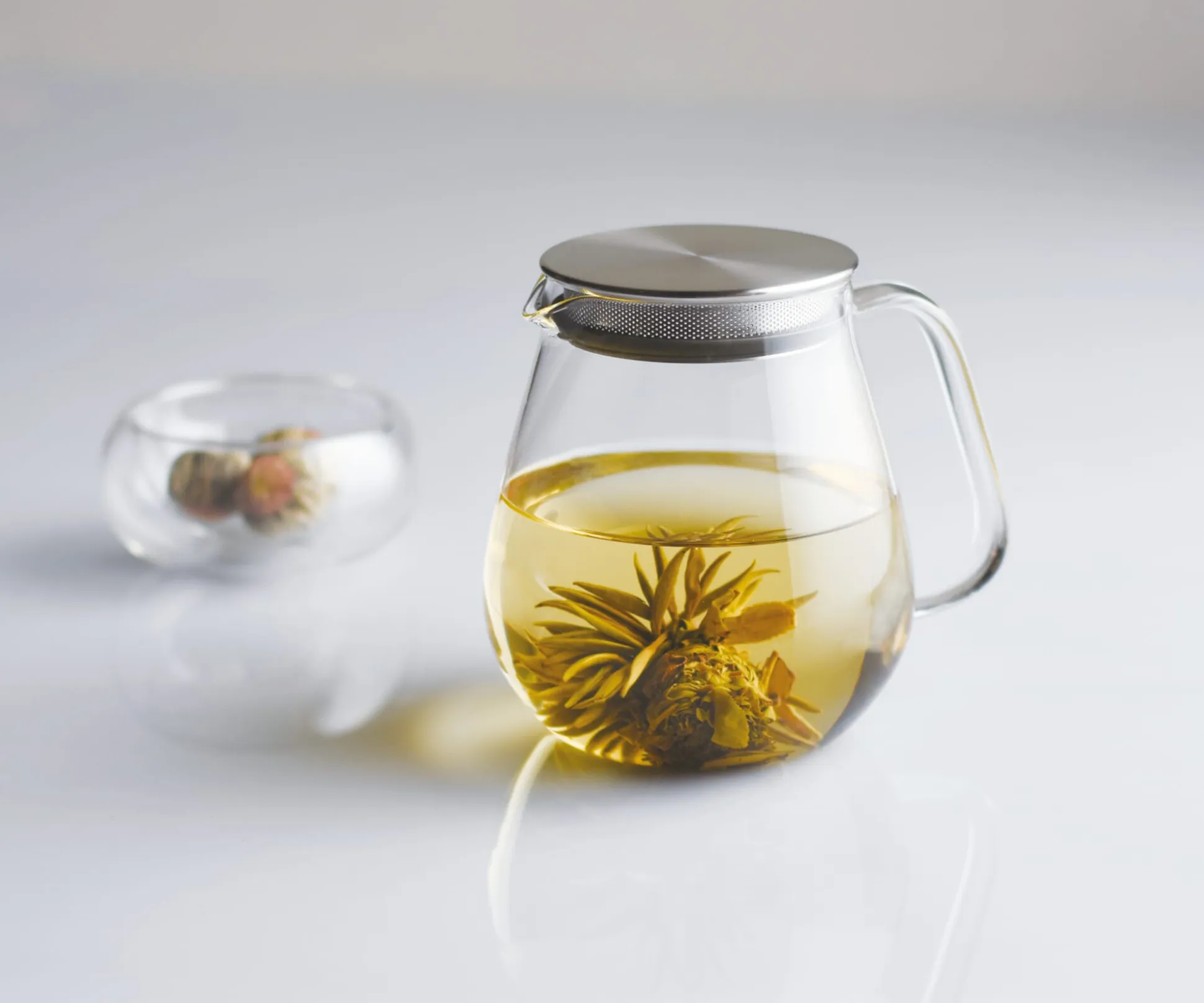 Formschöne Glaskanne, zwei Volumen – UNITEA bietet den Teeblättern in beiden Fällen großes Volumen, sich zu entfalten. Beim Ausgießen hält ein umlaufendes Sieb aus Edelstahl die losen Blätter.