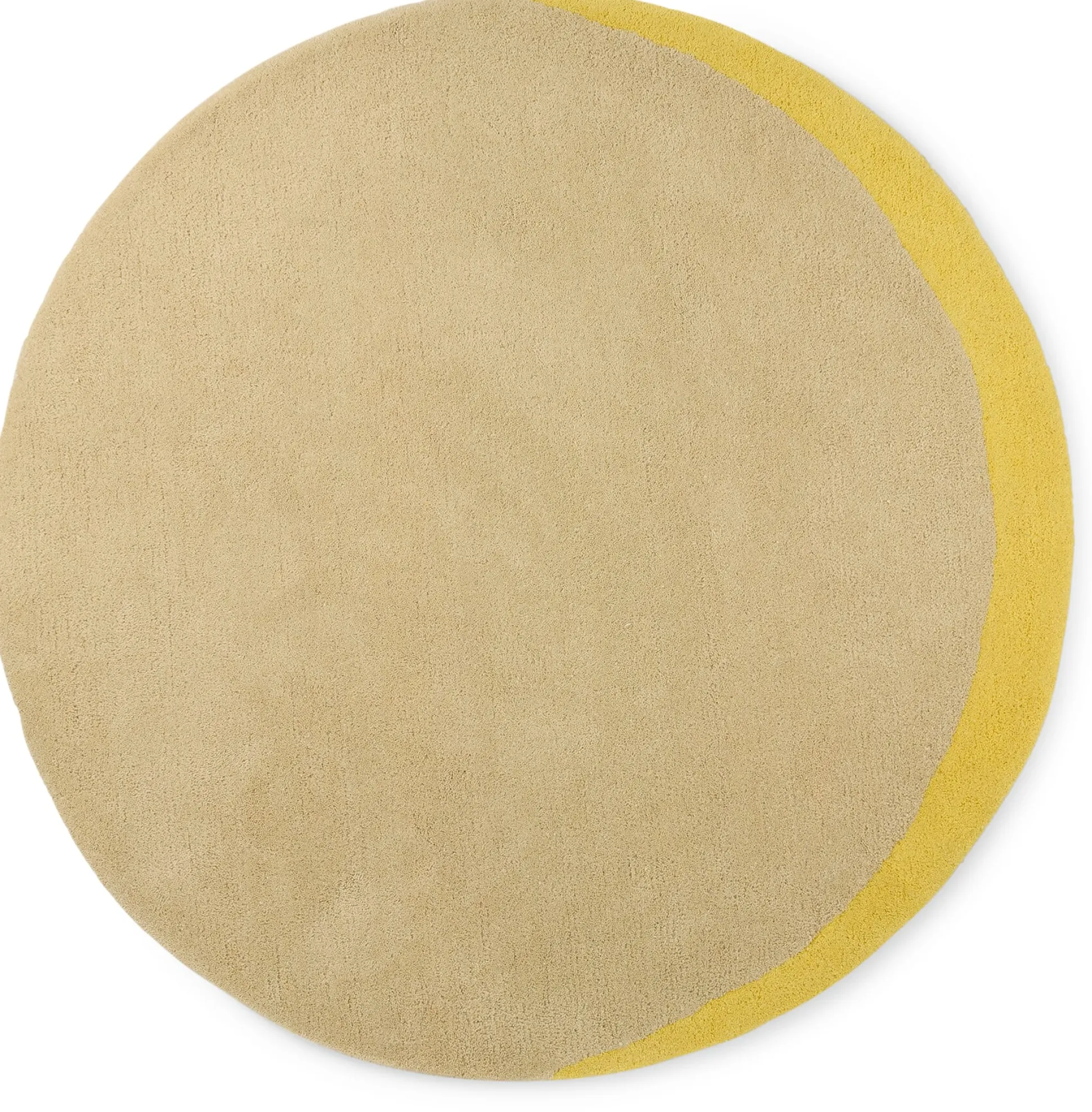 Runder Teppich in zwei Tönen aus Wolle getuftet: Die Grundfläche ist einfarbig, während der zweite Ton nur als feiner, punktuell gesetzter Rand erscheint – ähnlich dem hellen Lichtsaum bei einer Sonnenfinsternis. Das des Teppichs betont seine geometrische Perfektion und grafische Klarheit. Wie eine seltene Eclipse am Himmel wird der Teppich zum Hingucker auf dem Boden.