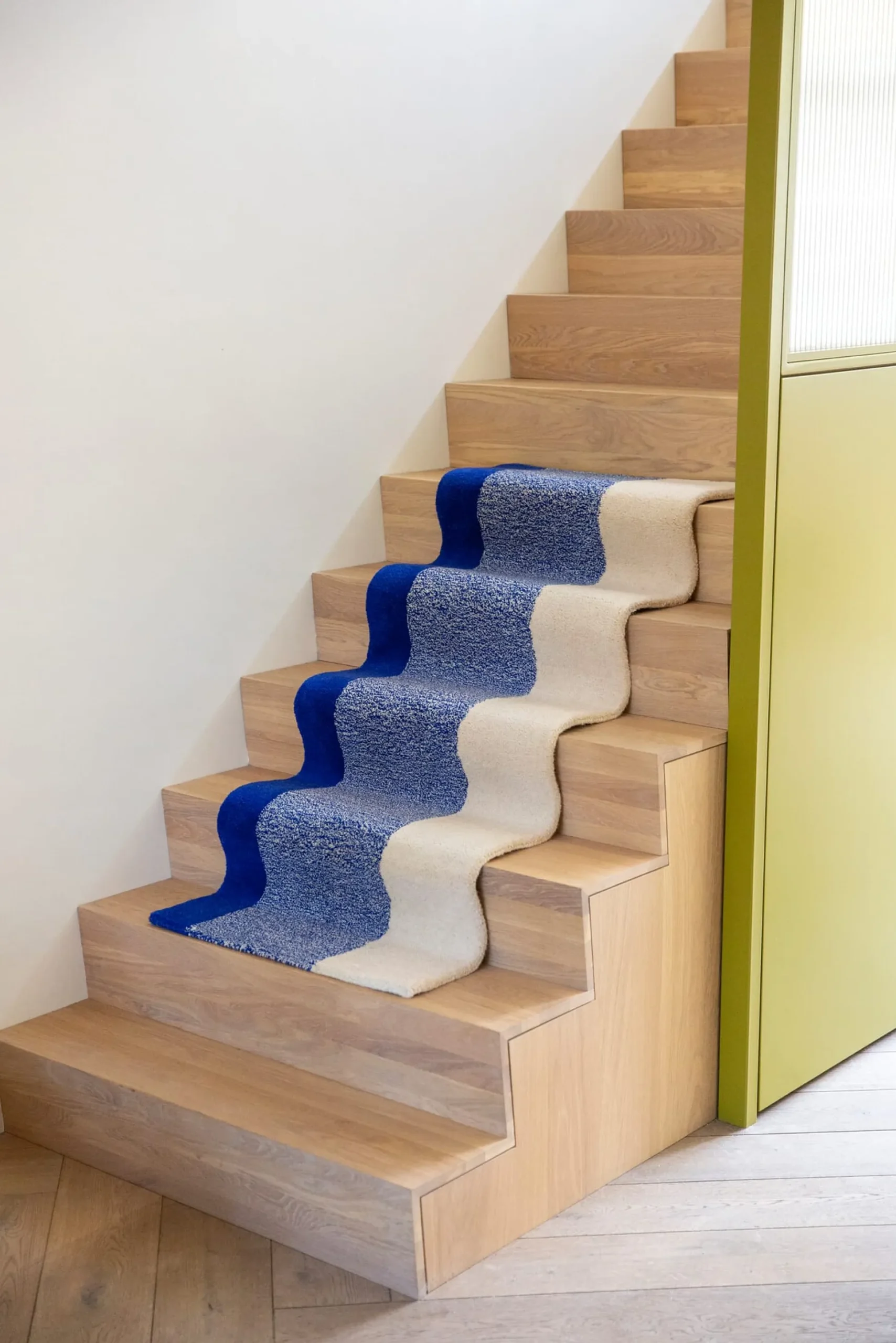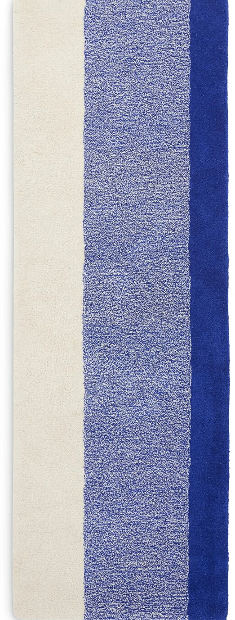 Teppichkollektion aus reiner Wolle, entworfen vom niederländischen Designer Lex Pott für Suite702. Die Teppiche tragen jeweils drei farbige Streifen. Die beiden äußeren Streifen sind in zwei unterschiedlichen Farben gestaltet, die sich im mittleren Streifen vermischen. So entsteht ein harmonischer Übergang zwischen den Farbbereichen. Ideal neben dem Bett oder im Flur. Auch für Barfußläufer geeignet, da schön weich und hochflorig.