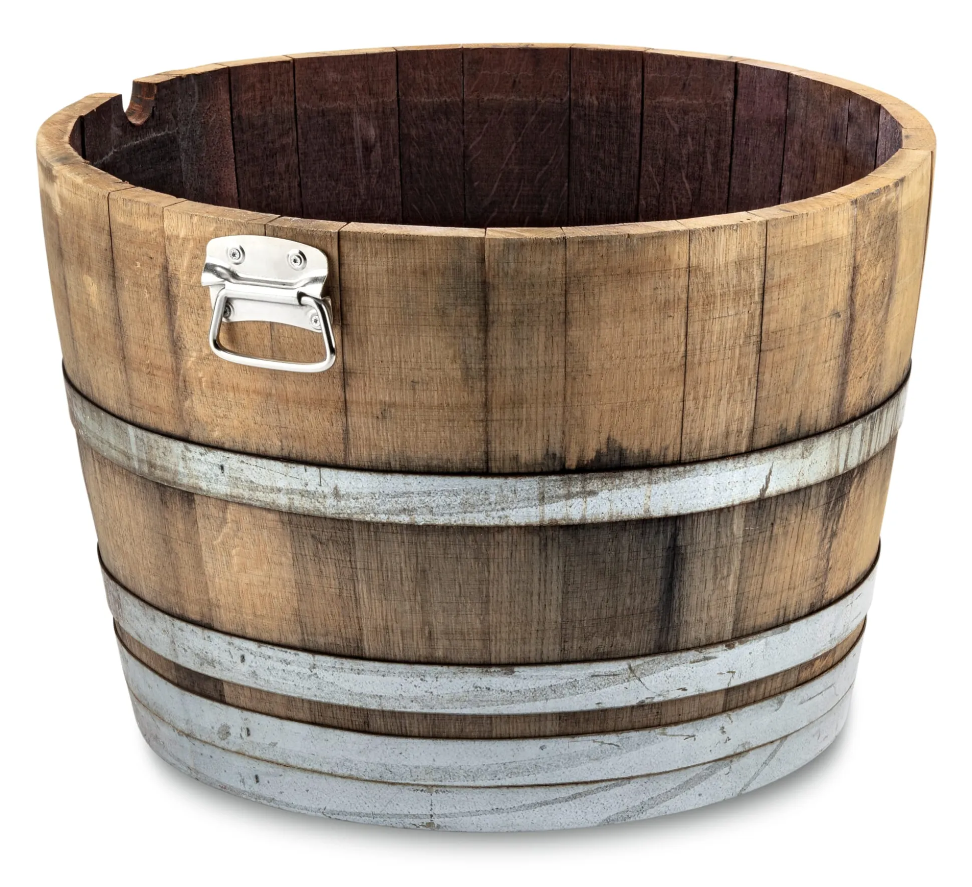 Aus Eichenholz (Herkunft Deutschland), Materialstärke 3 cm. Mit zwei Tragegriffen aus verzinktem Blech und Fassreifen aus verzinktem Flachstahl. Oben Ø 70 cm, unten Ø 58 cm. Höhe 48 cm. Innenmaße: oben Ø 63,5 cm, unten Ø 52,5 cm, Höhe 41 cm. Volumen ca. 95 l. Ausguss Breite 4 cm. Gewicht 25 kg. Nicht für die Haltung von Fischen oder anderen Wassertieren geeignet.