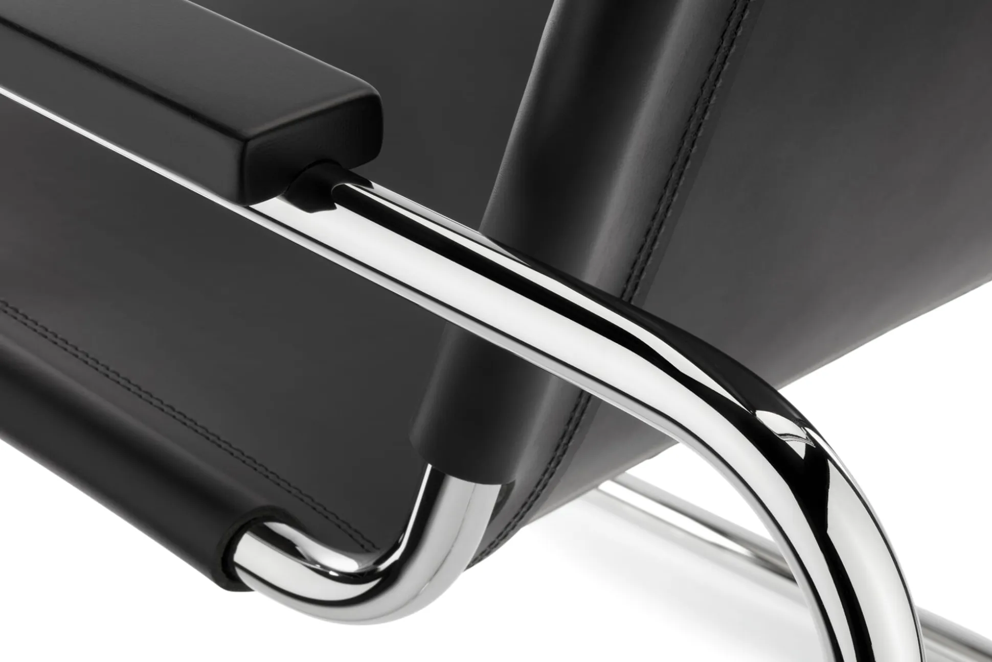 Gestell Stahlrohr verchromt (Ø 2,5 cm), mit demontierbaren Filzgleitern. Spannbügel Stahlrohr verchromt. Sitz und Rückenlehne aus Rind-Kernleder (Stärke 3 mm), vegetabil gegerbt und schwarz durchgefärbt. Armlehnen aus verchromtem Stahlrohr mit Ablagen aus schwarz gebeiztem Buchenholz, Länge 47 cm, Breite 5,5 cm. Rückenlehne Breite 49,5 cm, Höhe 55 cm. Sitzfläche 53 × 47 cm, Sitzhöhe 36 cm. Hergestellt in Deutschland.