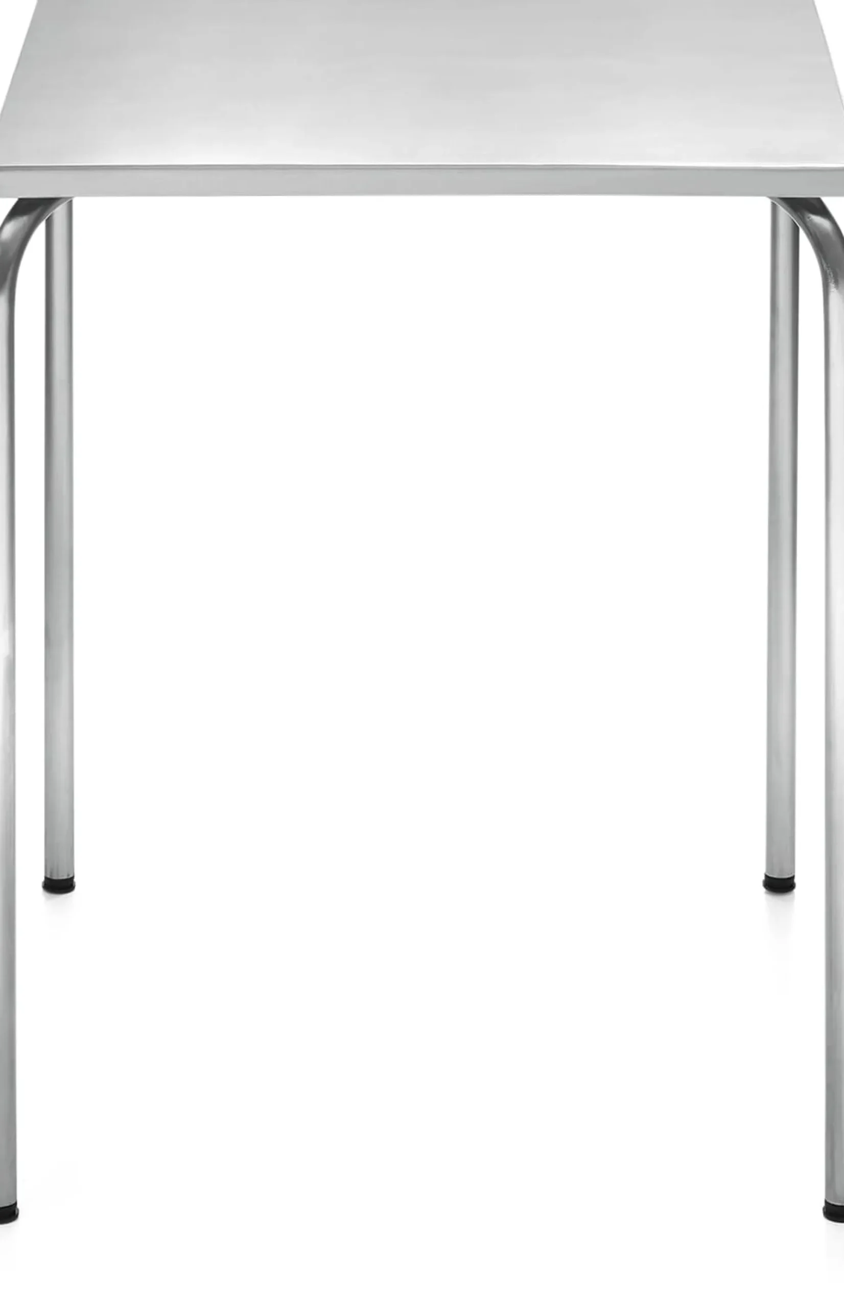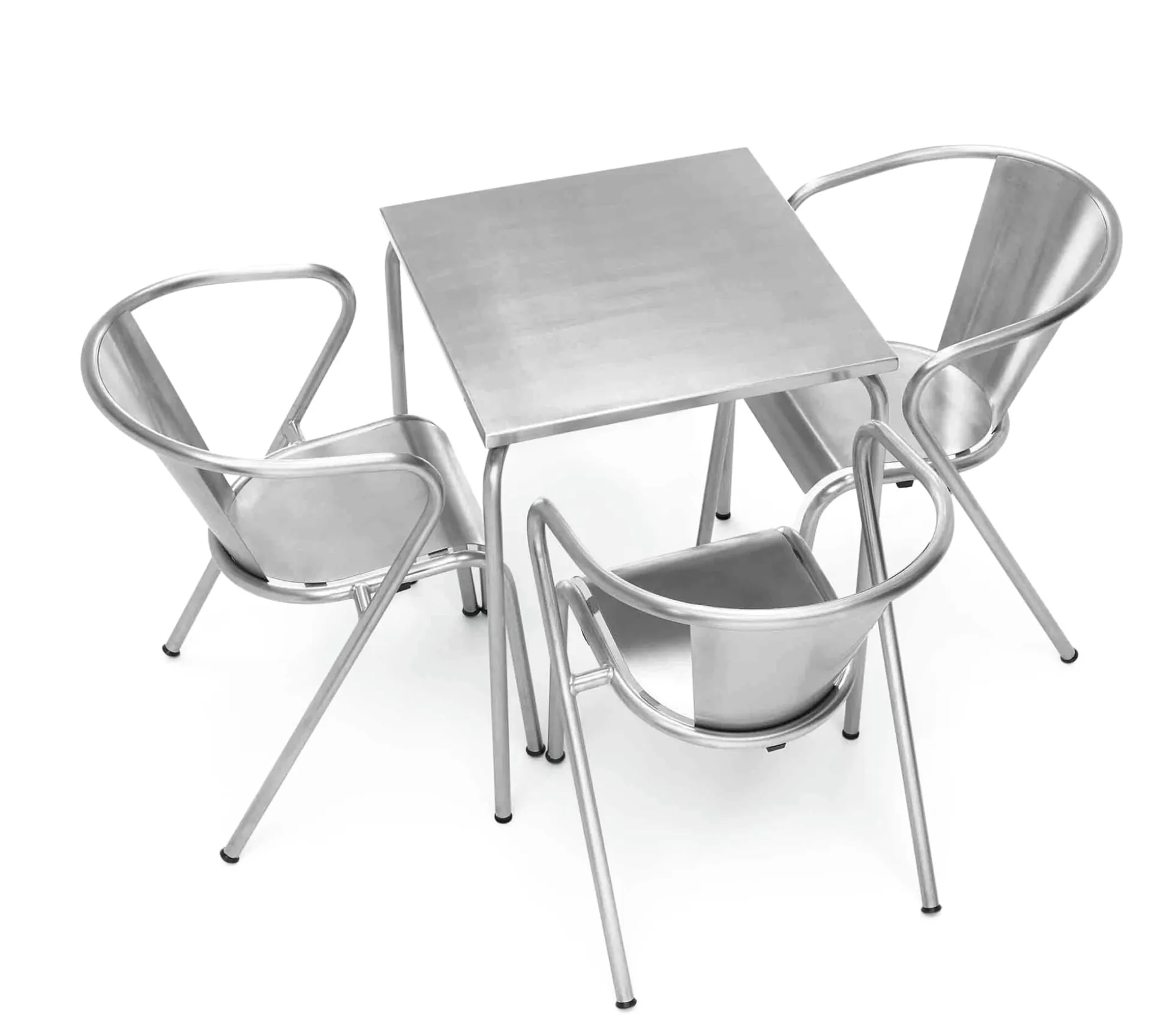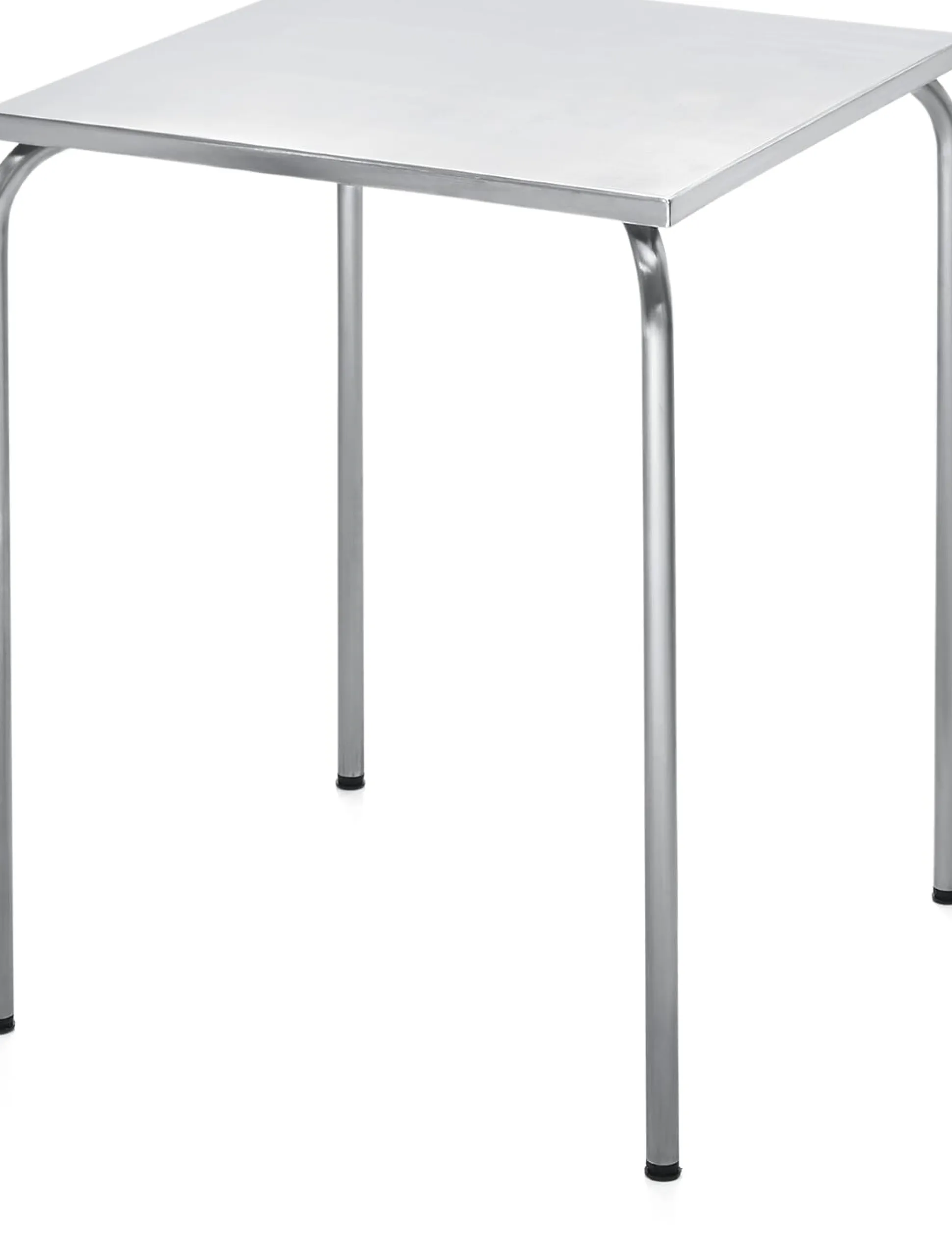 Der kleine Café-Tisch zum Stuhl ESTORIL – hier in Edelstahl in der Güte 316, einer dank des Molybdän-Anteils besonders widerstandsfähigen und pflegeleichten Version. Auch für die Nutzung in größerer Anzahl gut geeignet: kleine Fläche, stabiler Stand und stapelbar im Versatz.
