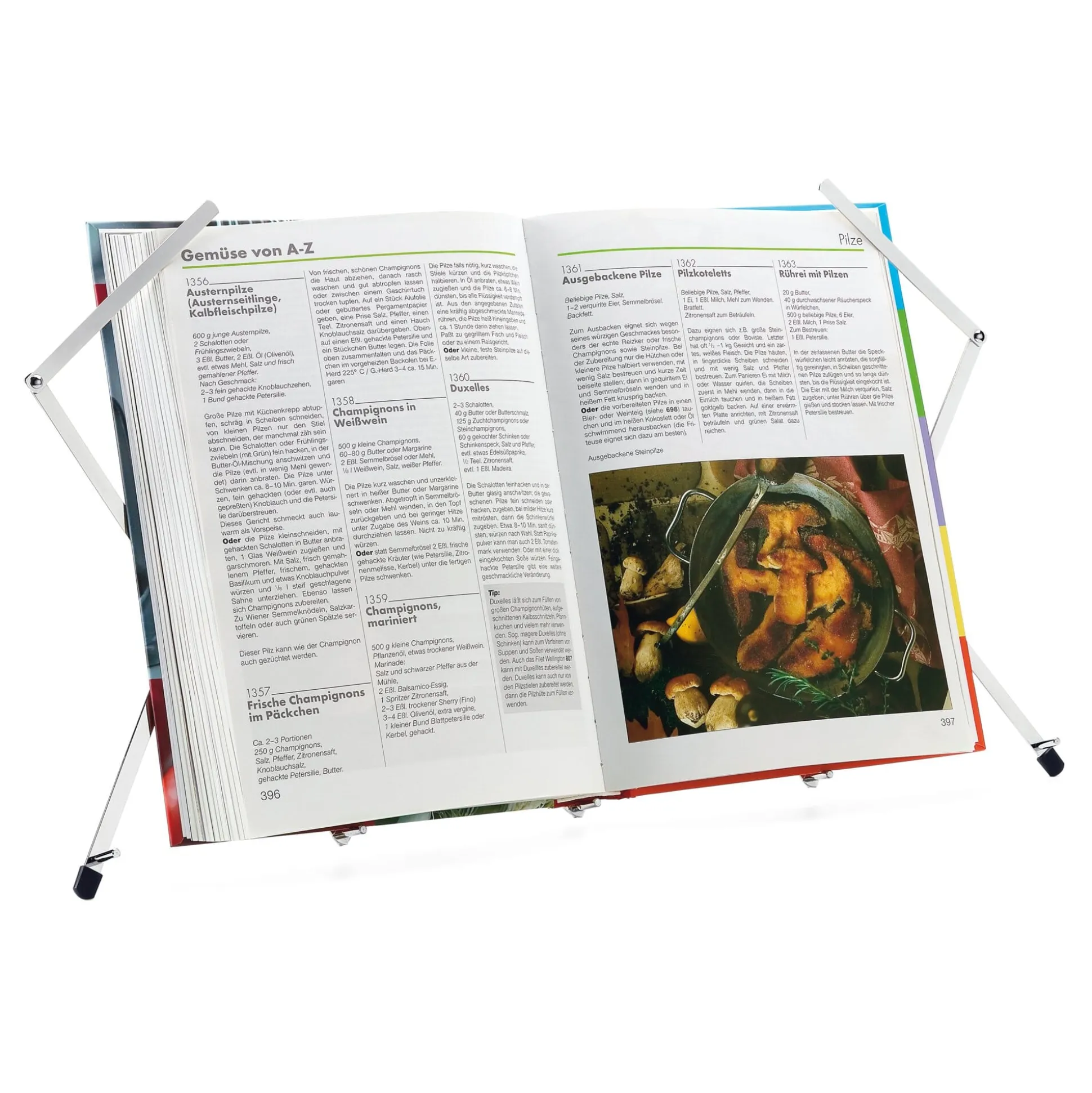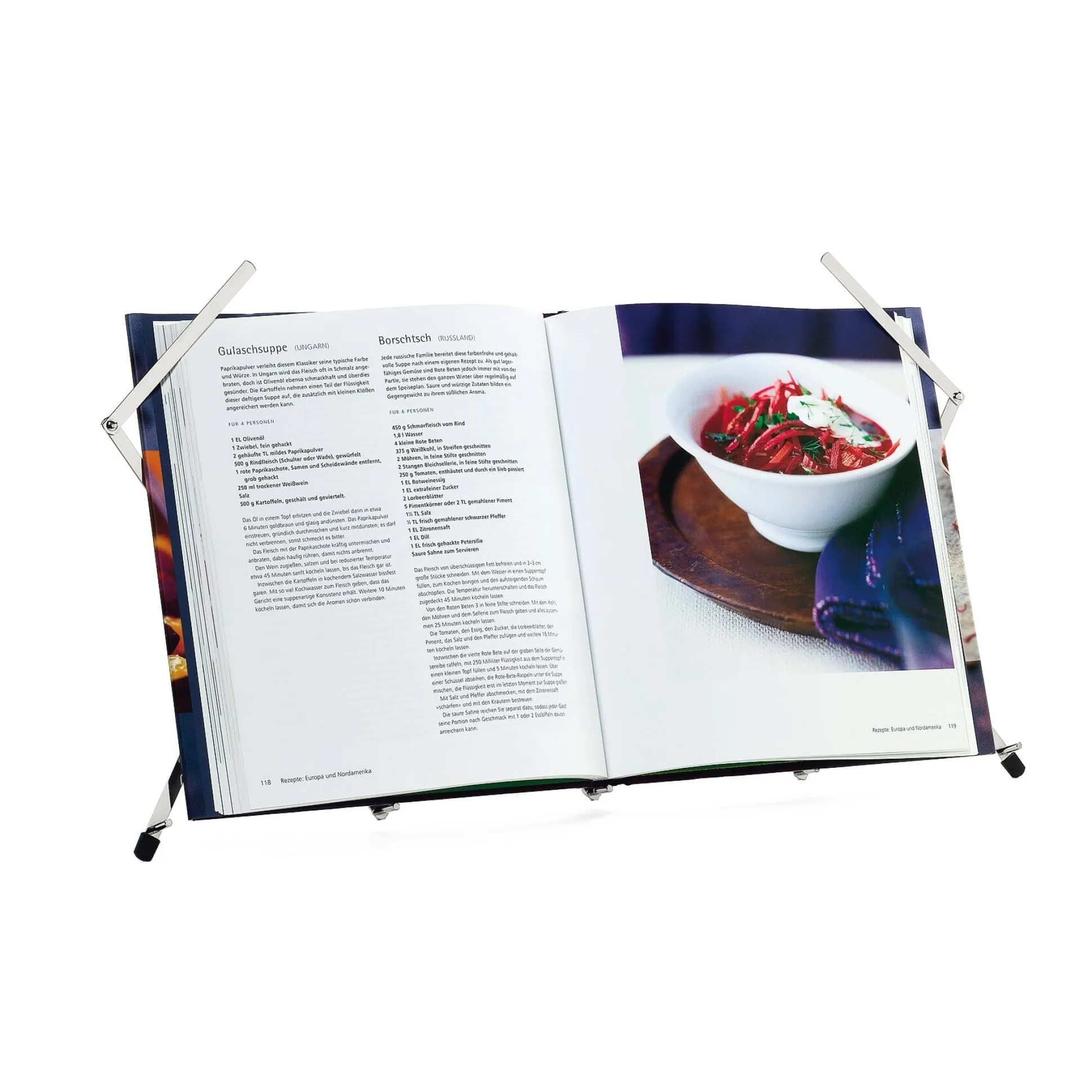 Angesichts des trivialen Zwecks, den sie zu erfüllen haben, kommen marktübliche Konzepthalter recht klobig daher und sind überdies häufig auf A4-Formate beschränkt. Die variable, faltbare, preisgünstige (und ansehnliche) Alternative kommt aus Süddeutschland. Das Scherenpult präsentiert neben A4-Hoch- und -Querformaten aufgeschlagene A4-Hefte und A3-Querformate.