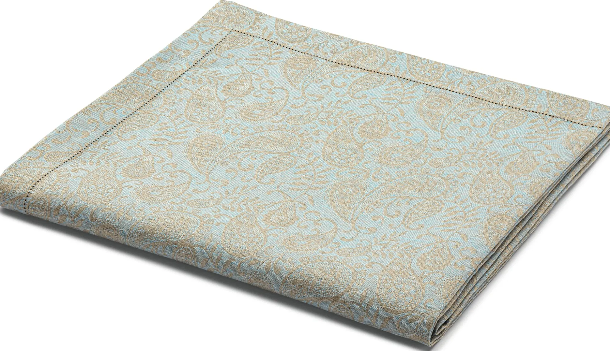 Auf Jacquard-Webstühlen entsteht das filigrane Paisley-Muster dieser Leinentischdecke. Für das Leinen wird Garn aus bestem europäischem Langfaserflachs verarbeitet, weshalb das Jacquardgewebe einen schönen, zart schimmernden Glanz zeigt – den leinentypischen Lüster. Durch den Einsatz von ungefärbtem Leinen in der Kette und gefärbtem Leinengarn im Schuss entsteht ein blauer Fond, von dem sich das naturfarbene Paisley schön abhebt. Beim naturfarbenen Muster wird das ungefärbte Garn im Schuss verwendet.