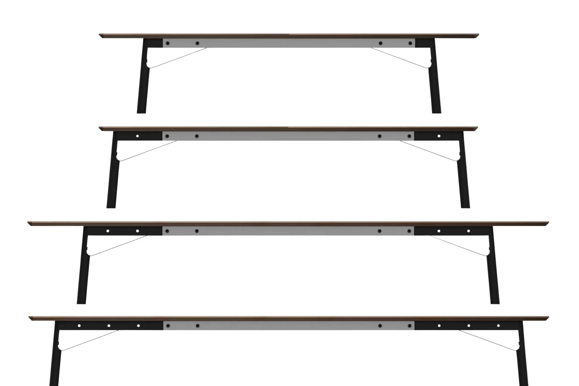 Wie aus dem Lehrbuch der Konstruktion: Diagonale heißt das Zauberwort! Beim Tischgestell ZEHDENICKER sorgt sie – elegant ausgeformt mit den an den Kopfseiten platzierten wannenartigen Bauteilen – für Stabilität und Verwindungssteifigkeit. Kein Wackeln, kein Schaukeln. Und das unabhängig davon, ob das Gestell im Architekturbüro oder am Essplatz eingesetzt wird. Aber auch sonst hat der formschöne und trotz seiner Robustheit und Stabilität fast filigran wirkende ZEHDENICKER allerhand zu bieten: Die stählernen Zargen des Tischgestells sind mit einem Lochraster versehen und erlauben es, das Gestell zwischen einer Breite von 135 bis 210 cm in festen Abständen zu variieren. Die beiden Wannen an den Köpfen des Tischs sind als Ablage für beispielsweise Servietten am Esstisch, Zeitungen oder auch die Mehrfachsteckdose am Arbeitsplatz zu nutzen. Zur Ausstattung gehören nivellierbare Stellfüße an den Tischbeinen. Alle Bauteile werden getrennt geliefert und sind mit wenigen Schrauben im Handumdrehen montiert.