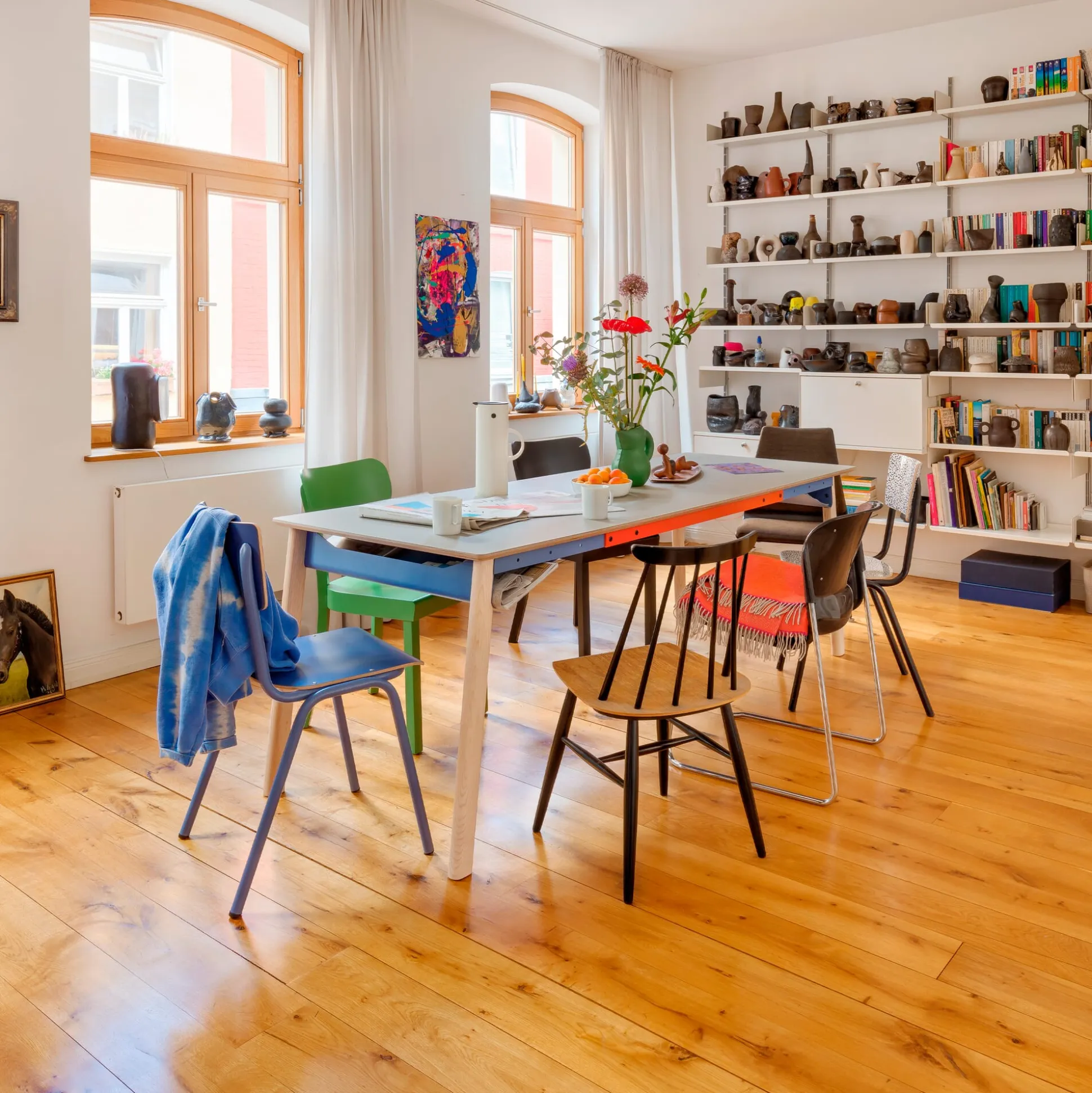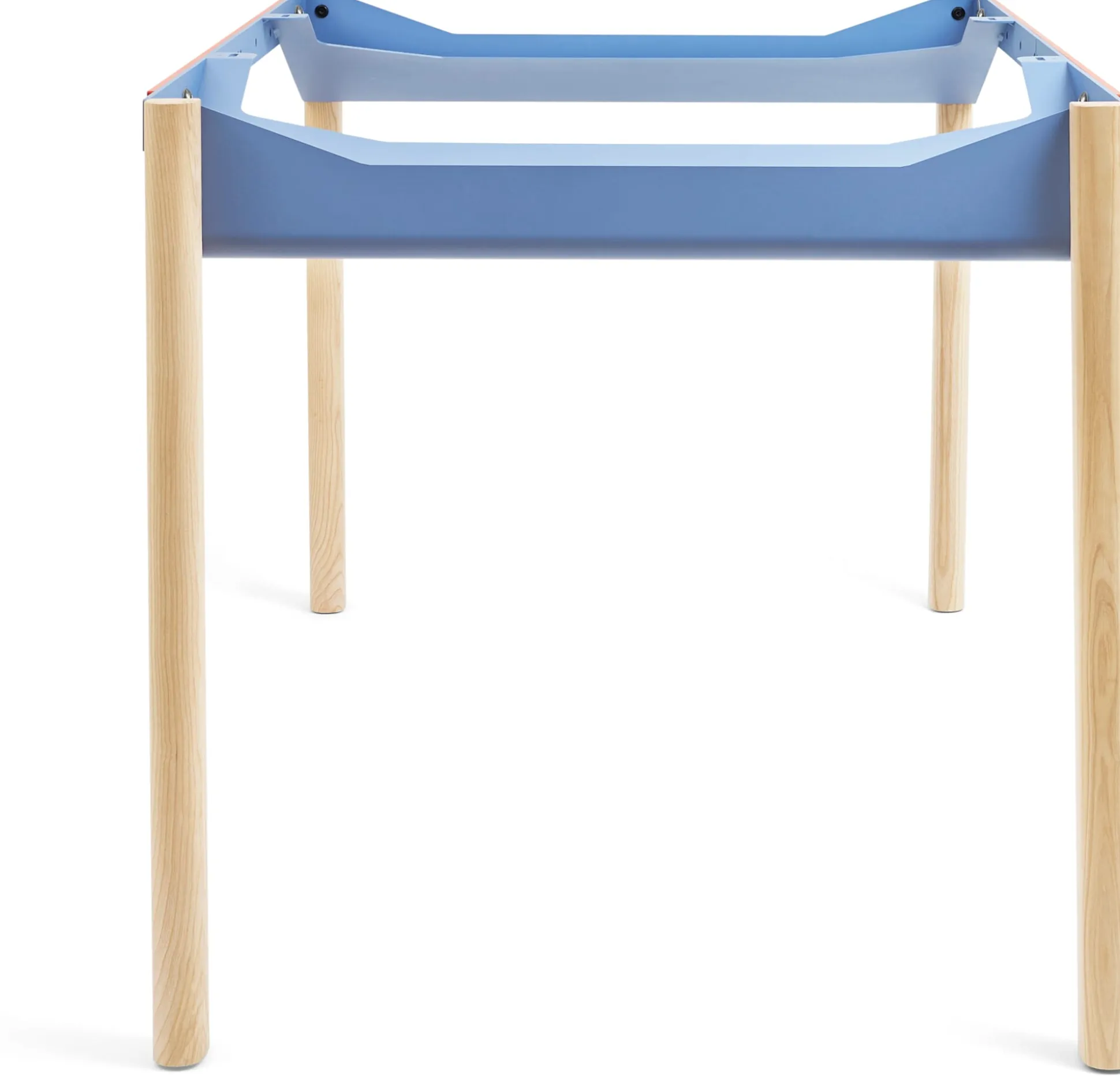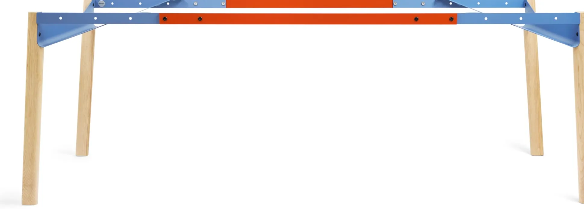 ZEHDENICKER in hölzerner Variante: Das markante Stahlgestell in den Akzentfarben Rotorange und Taubenblau steht auf soliden Holzbeinen aus massiver, unbehandelter Esche. Die bewährte Konstruktion bleibt: Diagonalverstrebungen und wannenartige Kopfbauteile sorgen für Stabilität und Verwindungssteifigkeit. Kein Wackeln, kein Schaukeln. Die stählernen Zargen des Tischgestells sind mit einem Lochraster versehen und erlauben es, das Gestell zwischen einer Breite von 135 bis 210 cm in festen Abständen zu variieren. Die beiden Wannen bieten praktische Ablageflächen – beispielsweise für Servietten am Esstisch, Zeitungen oder auch die Mehrfachsteckdose am Arbeitsplatz.