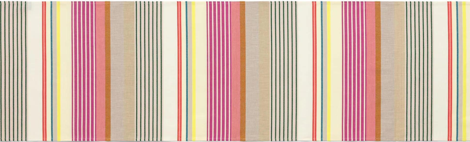 Die fröhlich bunten Streifen auf diesem Tischläufer holen uns den Sommer in Küche und Esszimmer und versetzen uns in richtig gute Laune. Die bleibt auch, wenn einmal etwas danebengeht, denn das Gewebe wird aus 60 Prozent kbA-Baumwolle und 40 Prozent strapazierbarem Leinen gefertigt und darf in die 60-Grad-Wäsche. Und falls Sie wie wir gar nicht genug von den farbigen Streifen bekommen können: Wir bieten auch ein Tischset und Kissenbezüge aus dem bunten Stoff an.