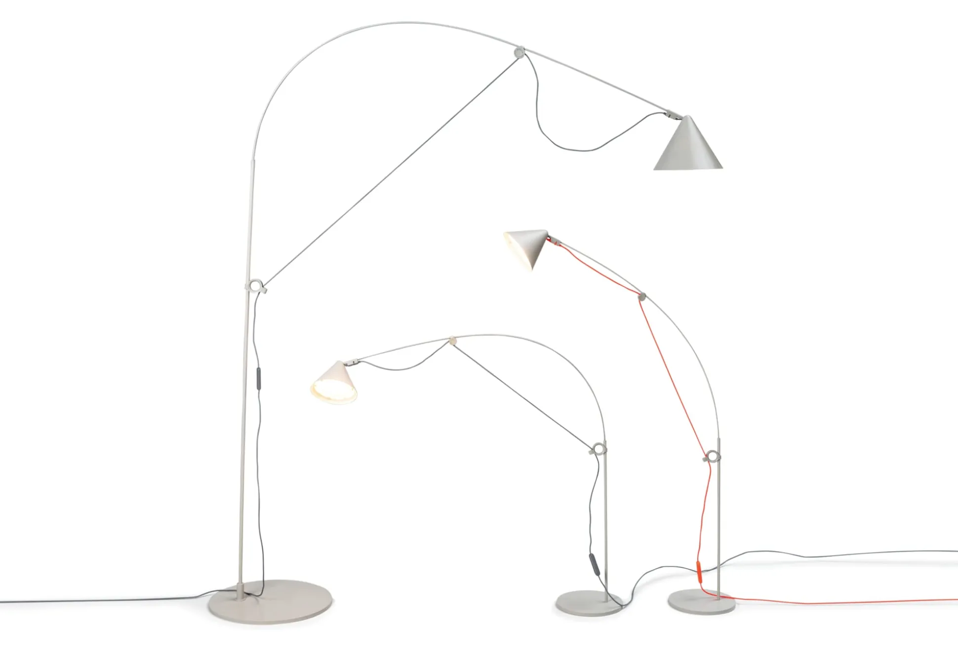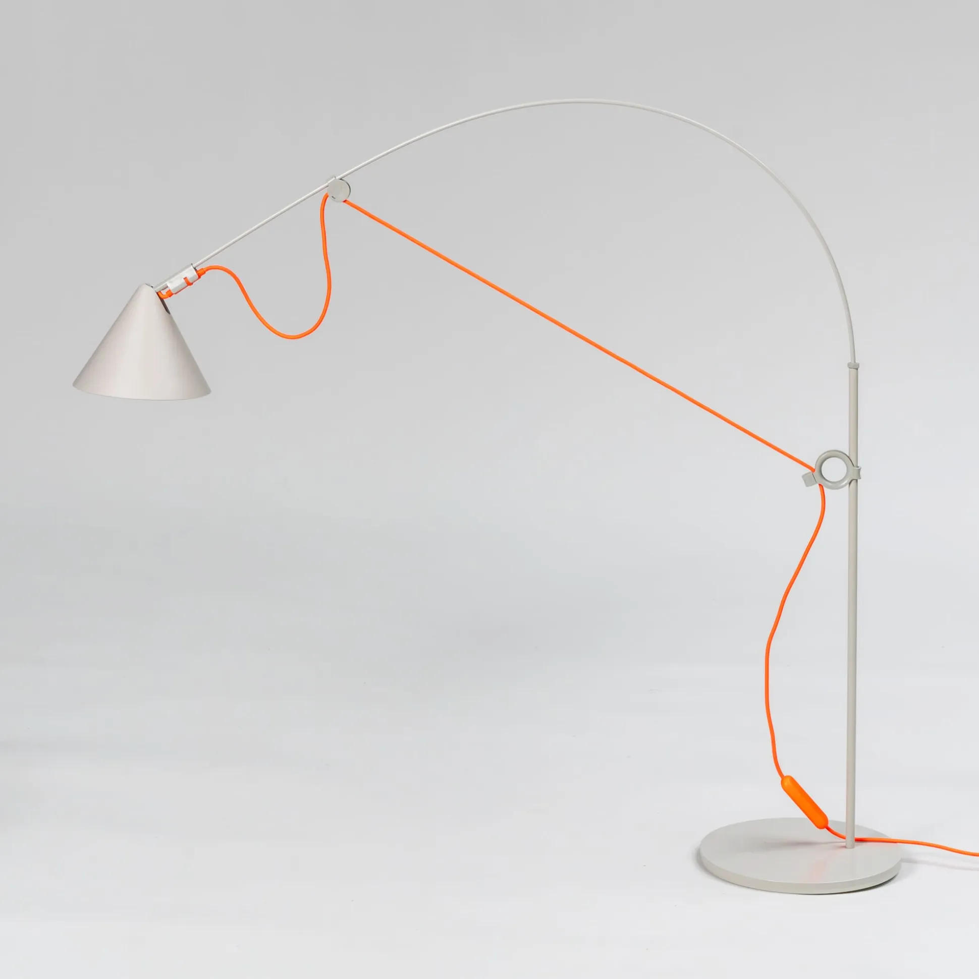 Das zentrale Merkmal der AYNO-Leuchtenfamilie ist ein Fiberglasstab, der durch das Leuchtenkabel zum Bogen geformt wird. Die Eigenspannung des Stabes ermöglicht eine gelenkfreie Konstruktion. Durch das Verschieben der beiden Verstellringe an Fuß und Kopf wird der Fiberglasstab in die gewünschte Position gebogen und das Licht in die benötigte Richtung gelenkt. Das Kabel spannt somit den Stab zu einem Bogen, dessen Radius sich durch die Verstellringe beliebig variieren lässt. Die Feinjustierung, also schlussendlich die exakte Ausrichtung des Lichts, erfolgt mit dem verstellbaren Leuchtenschirm.