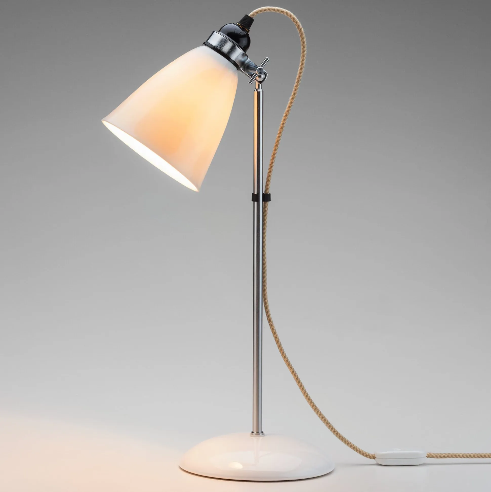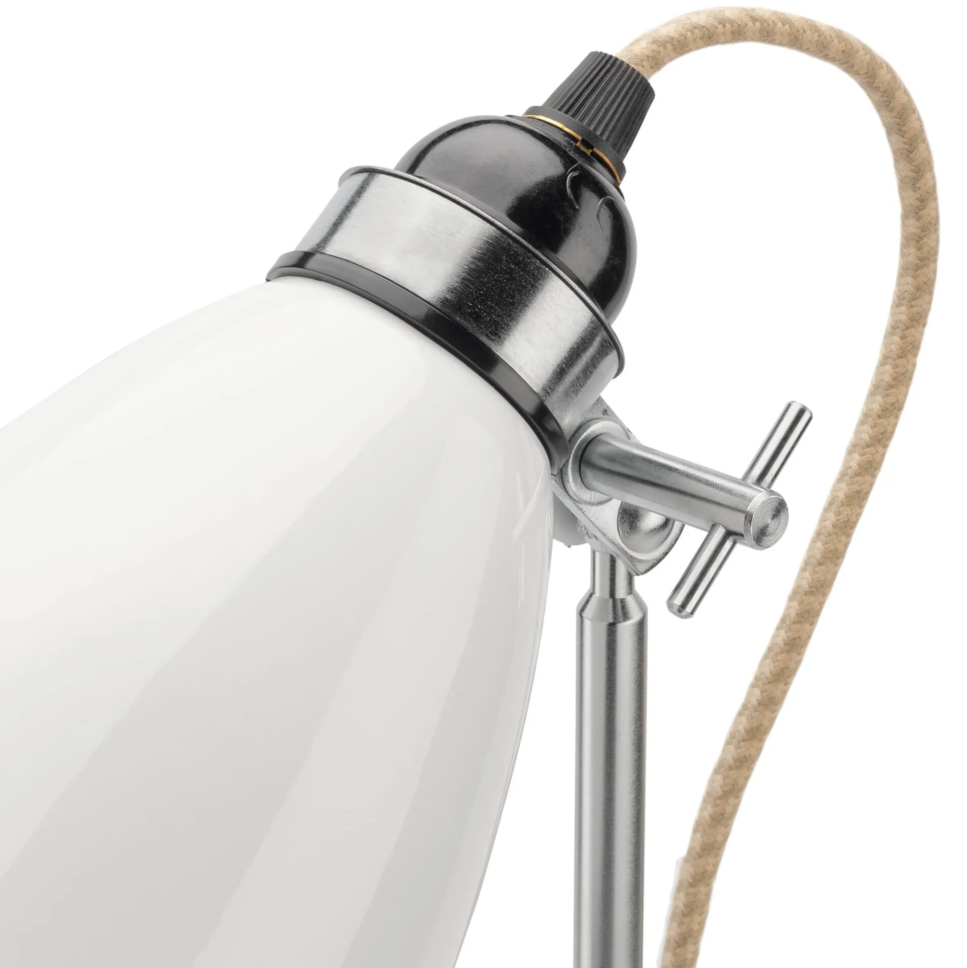 Schirm Bone China, Ø 12 cm. Stativ Aluminium. Porzellanfuß, Ø 15 cm, mit Stahlgewicht und Filzunterlage. Höhe 46 cm. Gewicht 1,5 kg. Textilkabel mit Eurostecker, Länge 2 m, Kunststofffassung E27 (max. 40 W). Lieferung ohne Leuchtmittel.