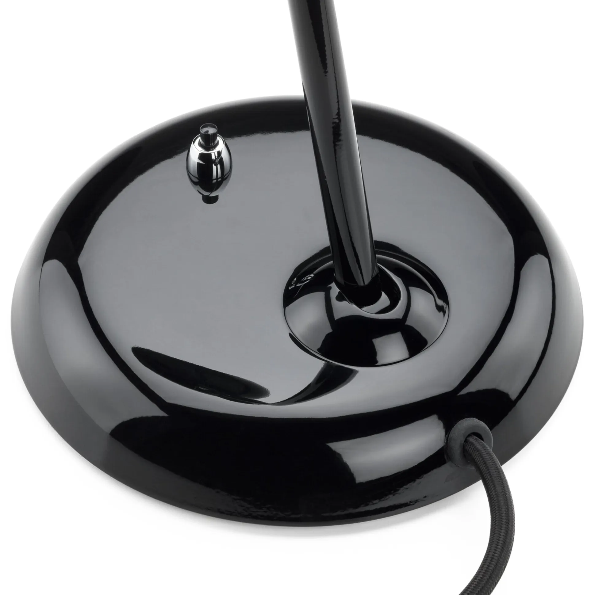Arm, Schirm (Ø 21,5 cm) und Fuß (Ø 18,5 cm) aus Stahlblech, von Hand schwarz nasslackiert. Innenlackierung weiß. Druckschalter, Stecker und Fassung (E27, max. 60 W) aus Duroplast. Schaltermanschette aus poliertem und verchromtem Messing.