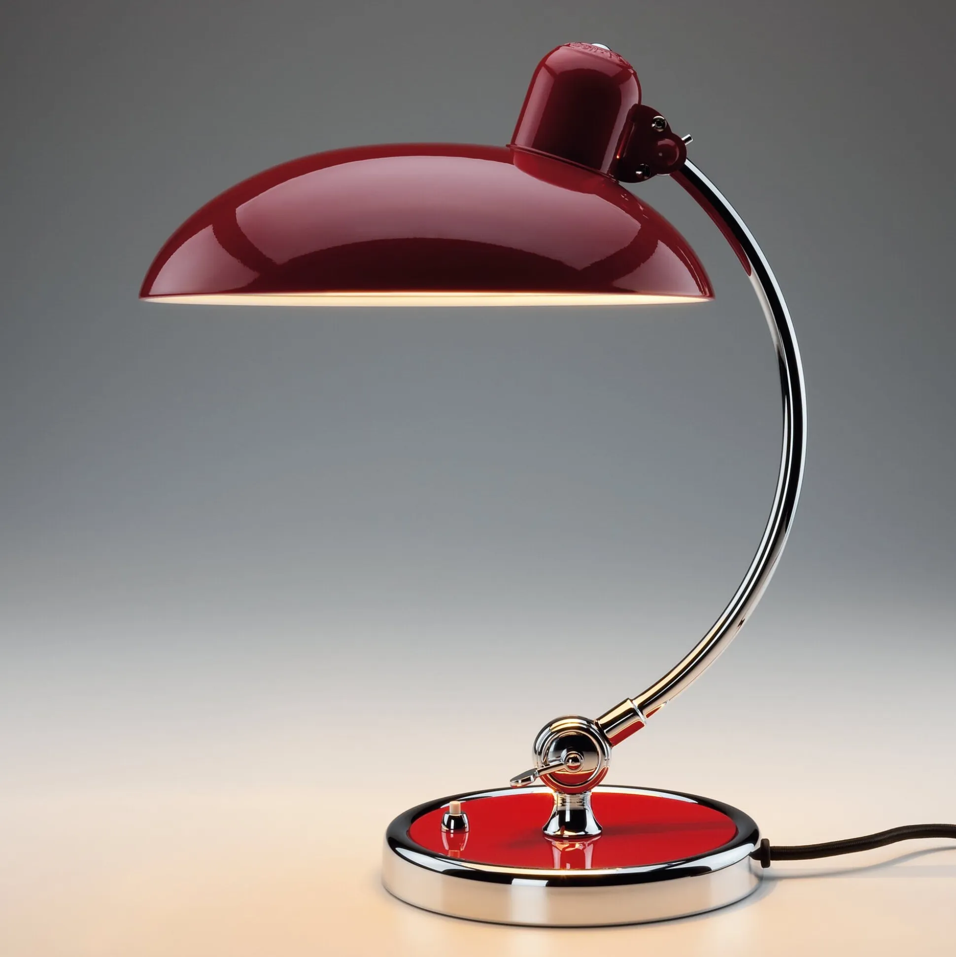 Dieser Entwurf von 1931 war das Flaggschiff der Büro-Tischleuchten aus der Kaiser Idell-Serie. Wer die vom Hersteller als „Luxusausführung“ bezeichnete Leuchte auf seinem Schreibtisch stehen hatte, deutete damit dezent seine gehobene Stellung in der Unternehmenshierarchie an. Der asymmetrische, hochglänzende Reflektorschirm und der Fuß werden von Hand nasslackiert (nicht etwa pulverbeschichtet) und poliert. Der geschwungene Arm besitzt ein Kippgelenk, der Schirm das ehemals von Kaiser patentierte und seinerzeit exklusiv verwendete Kugelgelenk. Die ausgeklügelte Form des Reflektors ermöglicht in Verbindung mit den Gelenken eine optimale, technisch ausgereifte Lichtlenkung.