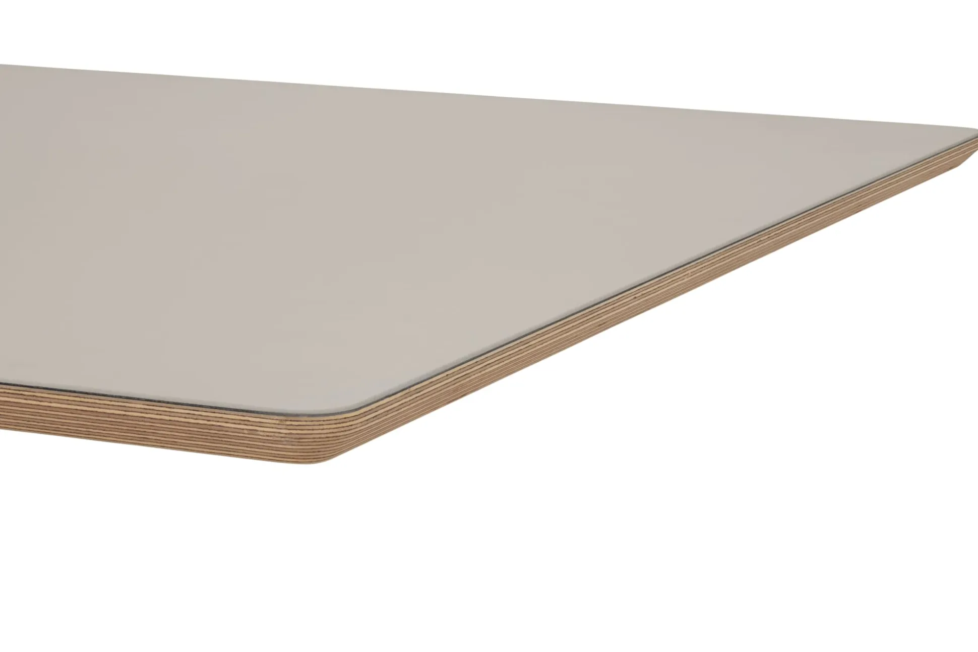 Die Tischplatte für das Tischgestell ZEHDENICKER in der perfekt profilierten Kantenform und gefertigt aus Birke Multiplex mit einem Belag aus hochwertigem Linoleum in Hellgrau. In den Größen 160 cm und 220 cm.
