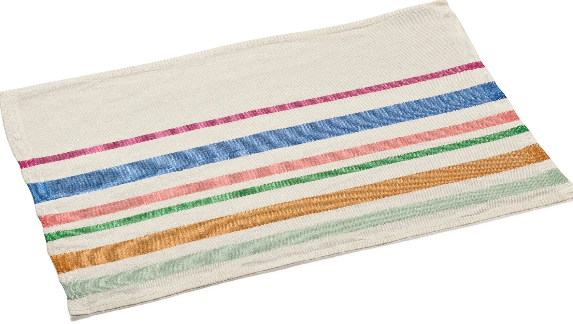 Ihr Design und die fröhlichen Farben verdankt das Tuch diesem kenianischen Einfluss, denn in den naturweißen Fond sind unterschiedlich breite, garngefärbte Streifen eingewebt. Das Leinengewebe wird nach dem Weben und Konfektionieren bereits vor Ort gewaschen, es erhält dadurch einen weichen Griff und eine lebendige Struktur – lässt sich daher aber auch nicht mehr perfekt glattbügeln. Nur beste Leinengarne aus Langfaserflachs europäischer Provenienz kommen auf die Webstühle des mittlerweile in der vierten Generation geführten Unternehmens. Die passende Tischdecke und ein Geschirrtuch sind ebenfalls erhältlich.