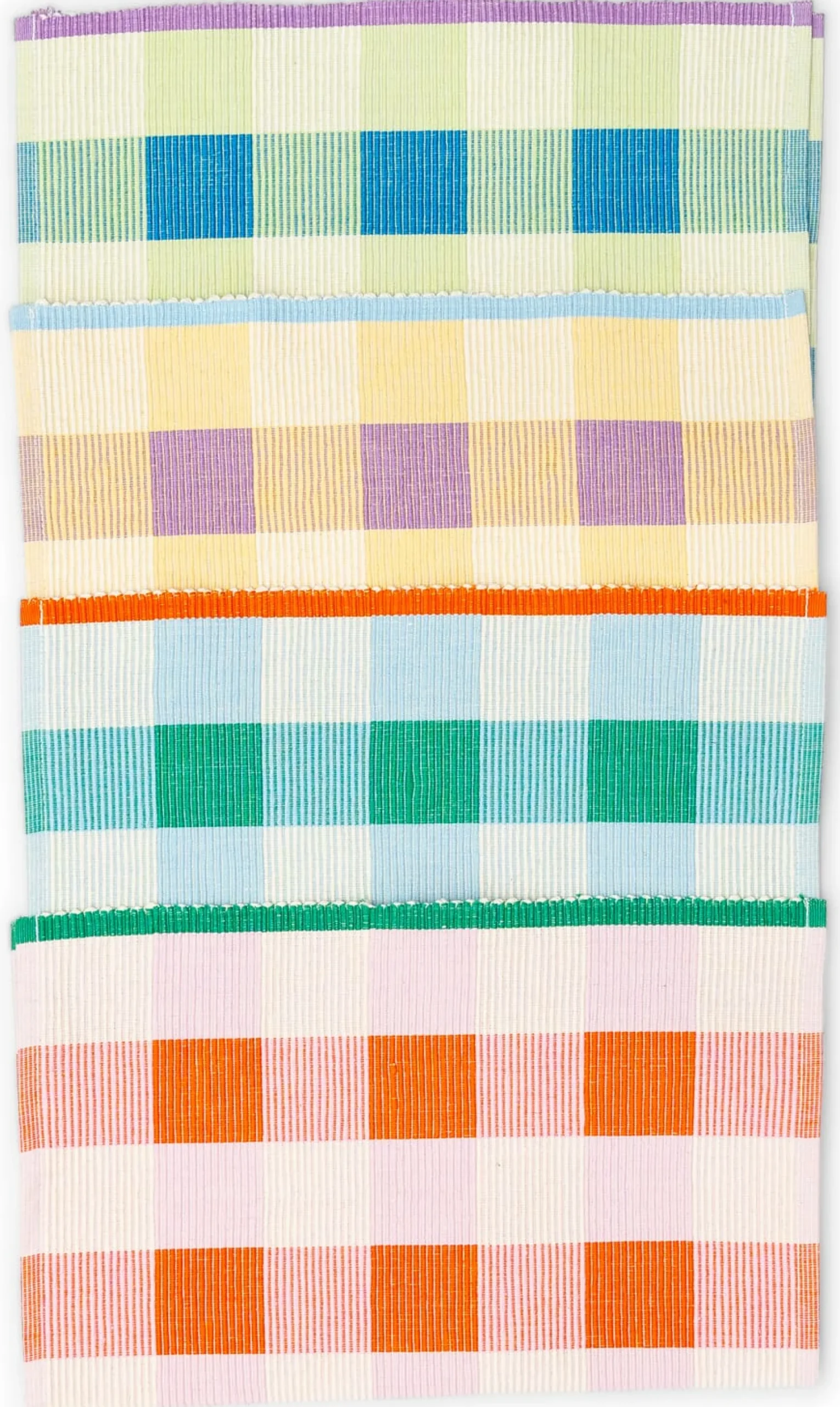 Farbenfrohe Tischsets in reiner Baumwolle: entworfen in Barcelona, in Indien von Hand gewebt. Die flache Rippenstruktur macht die Sets griffig und fest. Schön: Die verschiedenen Farbstellungen lassen sich toll zu einer bunten Tischlandschaft kombinieren.