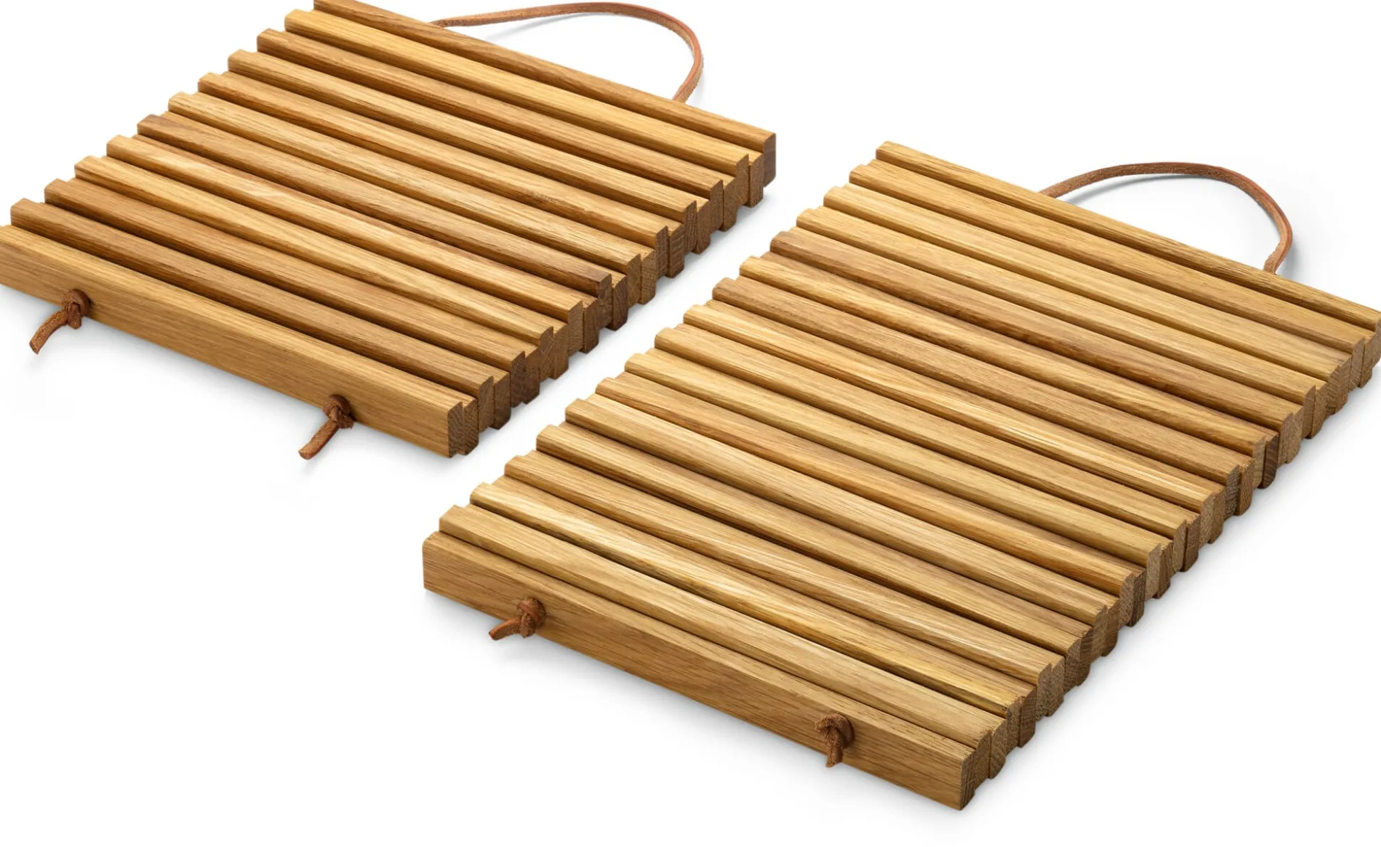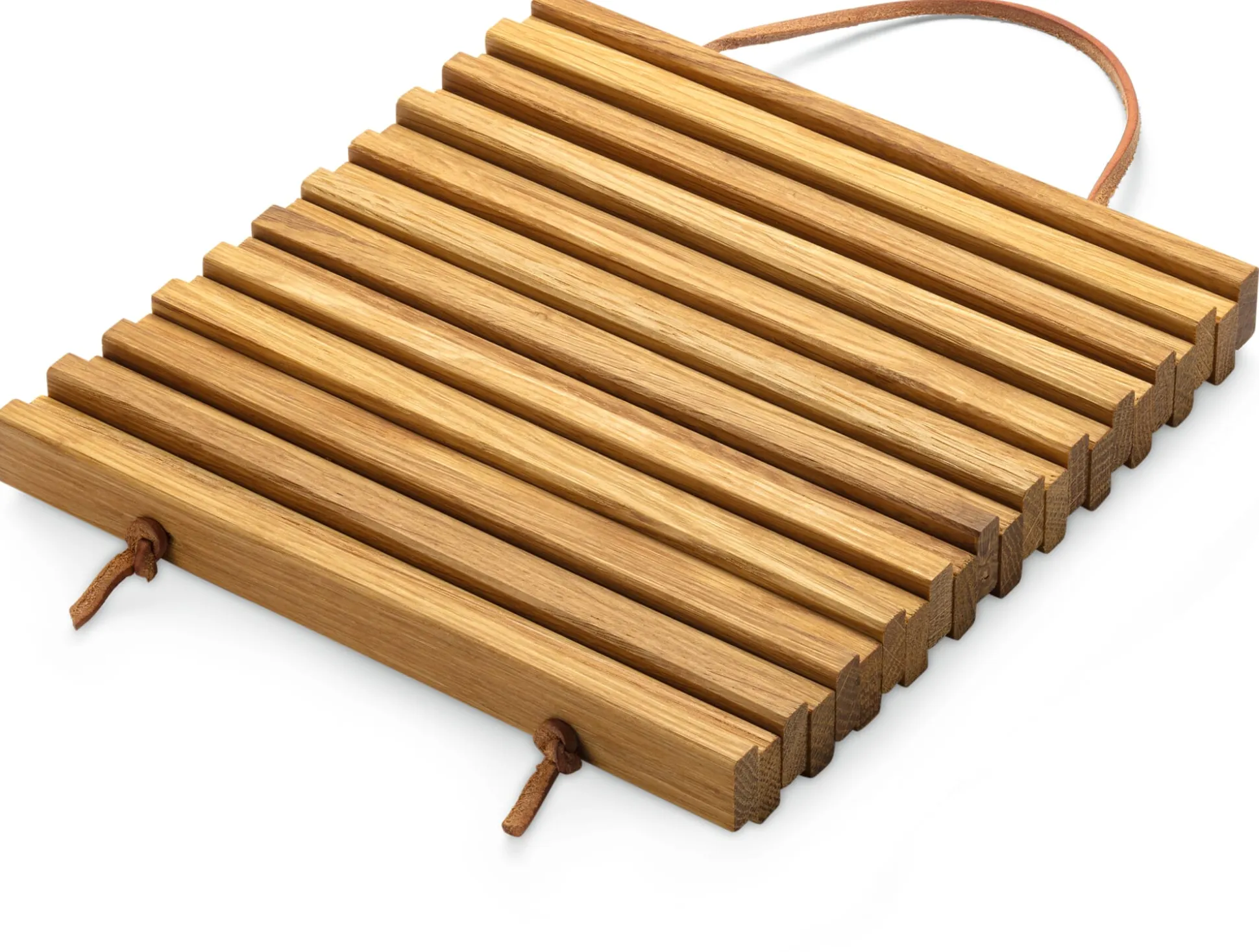Sieht schlicht aus, ist aber in der Fertigung nicht einmal ganz unaufwändig. Dieser schöne Topfuntersetzer erfüllt seinen Zweck auf das Beste. Die Holzteile aus Eichenholz werden aus dem Leisten gesägt, mit passgenau gesetzten Bohrlöchern versehen und von einem an den unteren Enden geknoteten Lederband zusammengehalten. Achten Sie einmal auf die sauber verarbeiteten, glatt geschliffenen Sägekanten: Dort wird die Struktur und Maserung des Eichenholzes noch unverstellt sichtbar gemacht und zeigt sich in natürlichen Abstufungen des Holzfarbtons von hell zu dunkel. Wir bieten diesen Klassiker unter den Topfuntersetzern in zwei Größen an. Praktisch: Die Lederschlaufe kann zur hängenden Aufbewahrung des Untersetzers genutzt werden. Zur Verlängerung der Haltbarkeit werden die Holzoberflächen geölt.