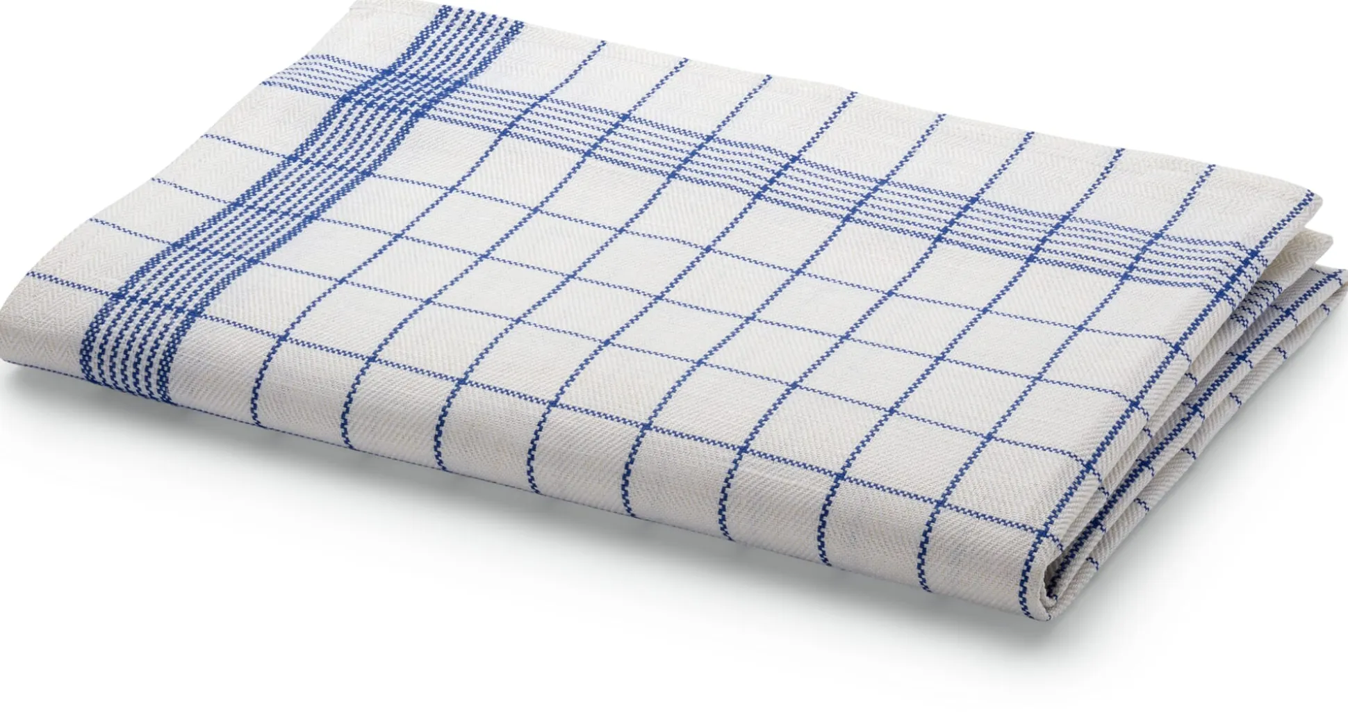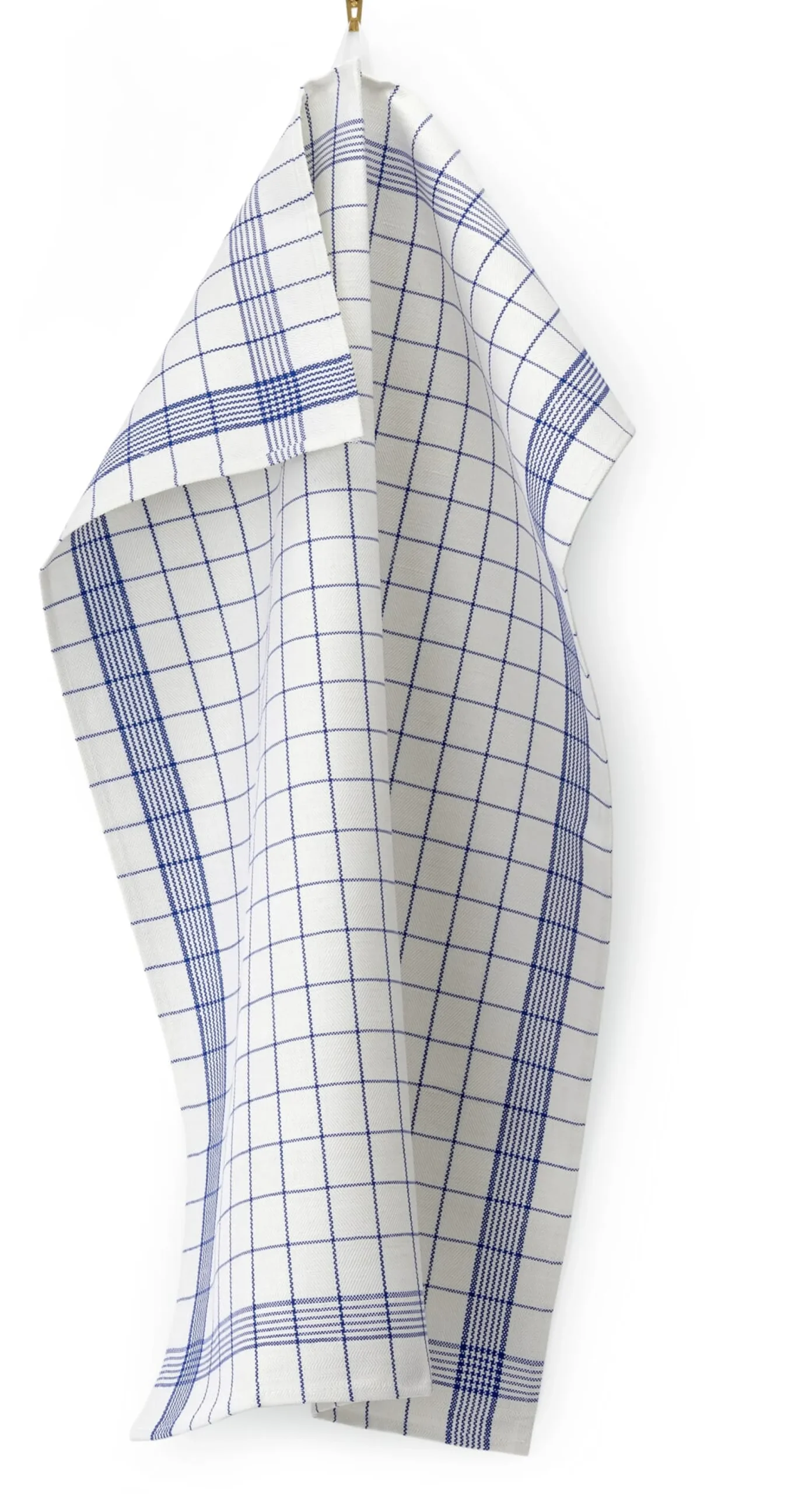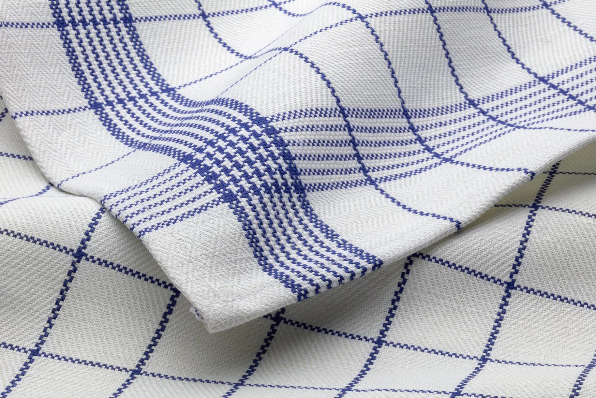 Mit der Kurzformel „Trockenperle – das Schnelltrockentuch“ warb dieses Zwirntuch schon 1937 für seine außergewöhnliche Webart, die größte Aufsaugfähigkeit dank des Flächengewichts von 240 g/qm und schnellstes Wiedertrocknen bewirkt: gezwirntes Baumwollgarn in der Kette (Garnfeinheit Nm 24/2) und festes Leinengarn im Schuss (Garnfeinheit Nm 18) sind in versetztem Spitzköper mehrbahnig gewebt. Wir bieten es in zwei Farbstellungen an: mit weißem Fond und blauen Streifen (Weiß-Blau) und mit blauem Fond und weißen Streifen (Blau-Weiß).