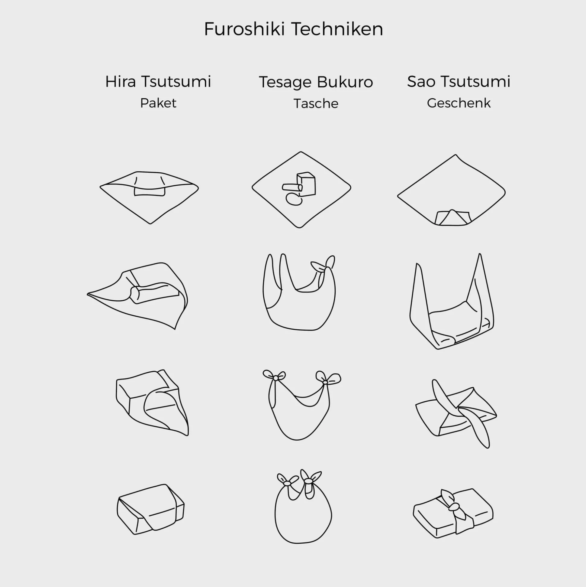 Ein Furoshiki ist ein quadratisches Tuch, das in Japan traditionell als Verpackung und als Tragebeutel genutzt wird. Ursprünglich wurden sie in Japan in Badehäusern (Onsen) verwendet, um Kleidung zu verpacken und Verwechslungen zu vermeiden, und zwar bereits vor mehr als 1.000 Jahren. Die traditionellen Furoshiki gerieten aufgrund der Massenproduktion von Plastik- und Papiertüten lange Zeit in den Hintergrund, sie galten dann als altmodisch und umständlich.