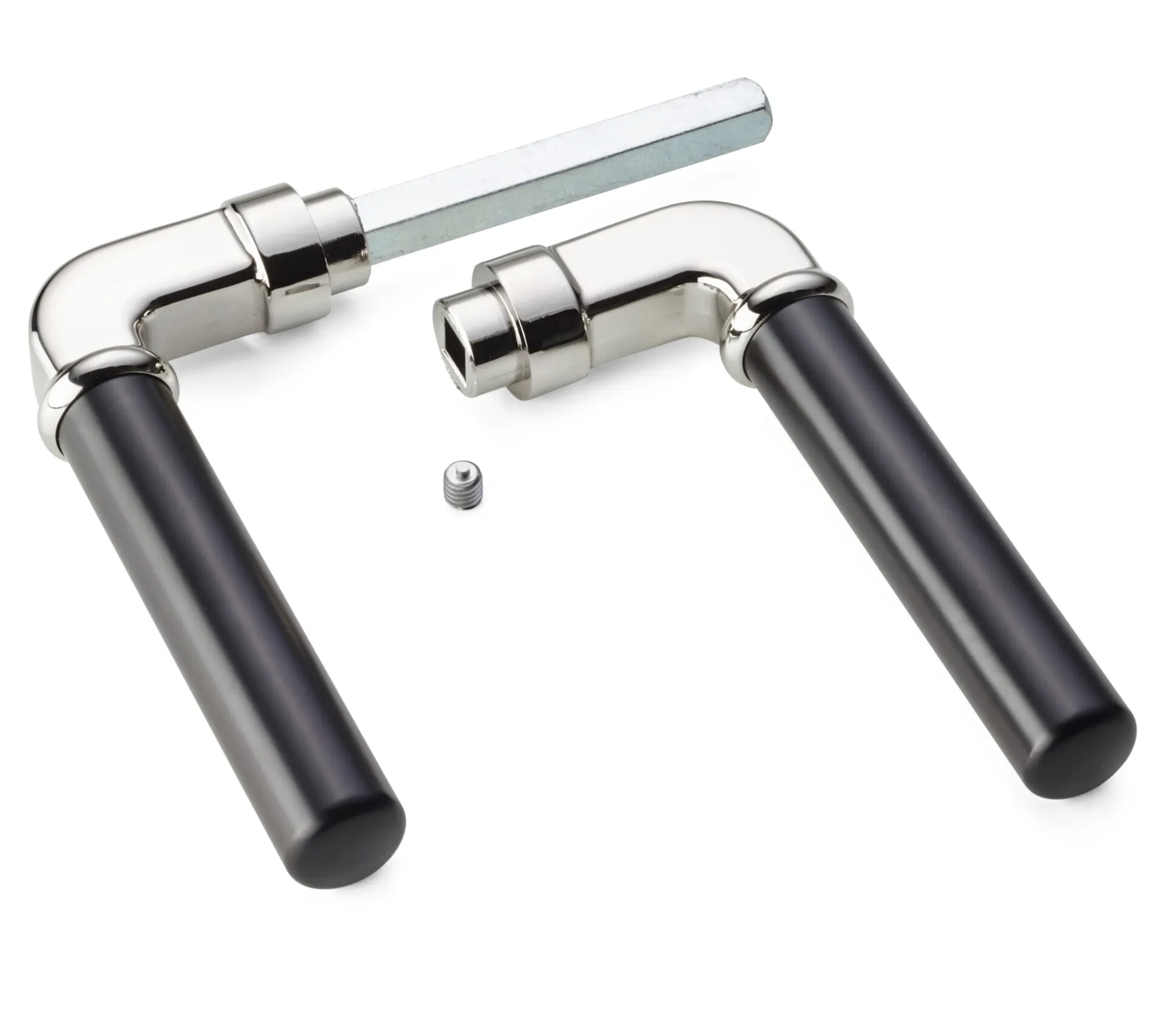 2 Türklinken aus Zinkdruckguss, vernickelt und poliert. Griffstück schwarz lackiert. Grifflänge 11,5 cm, 2 cm Ø. Gewicht eines Griffs 190 g. Zu verwenden mit den passenden Langschildern oder Rosetten (welche nicht in der Lieferung enthalten sind). Lieferung ohne Schrauben.