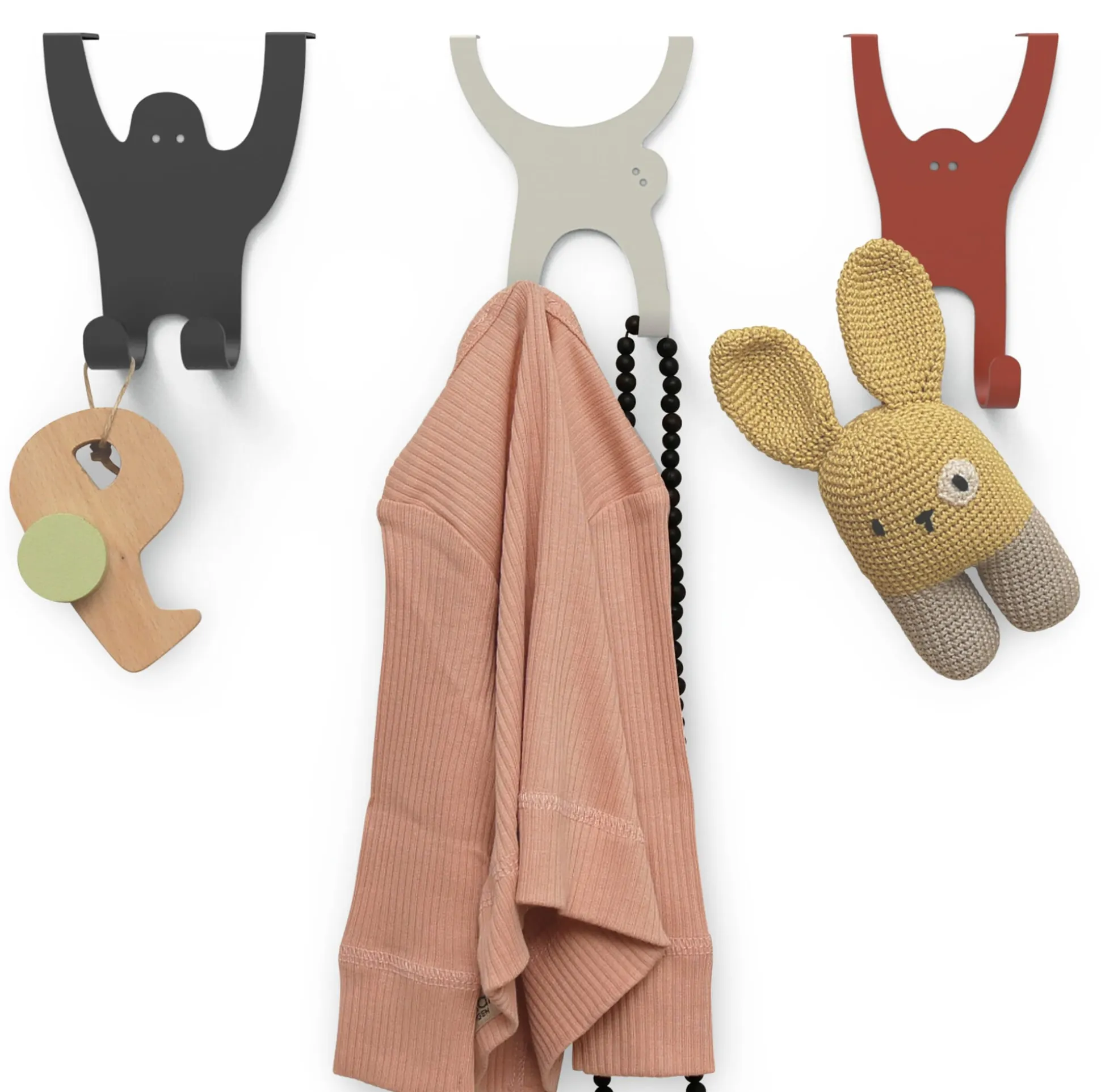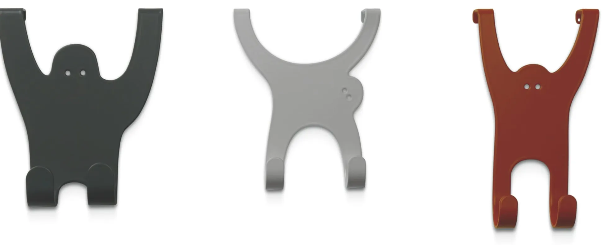 Die Affenbande bietet ihre langen Gliedmaßen zum einen als Haken und zum anderen als sichere Halterung an Standardtürblättern (bis ca. 18 mm) an. Das Set besteht aus einem Gorilla, einem Orang-Utan und einem Gibbon. Drei in der Form von Affen gelaserte und gefaltete Blechformteile in drei verschiedenen Farben.