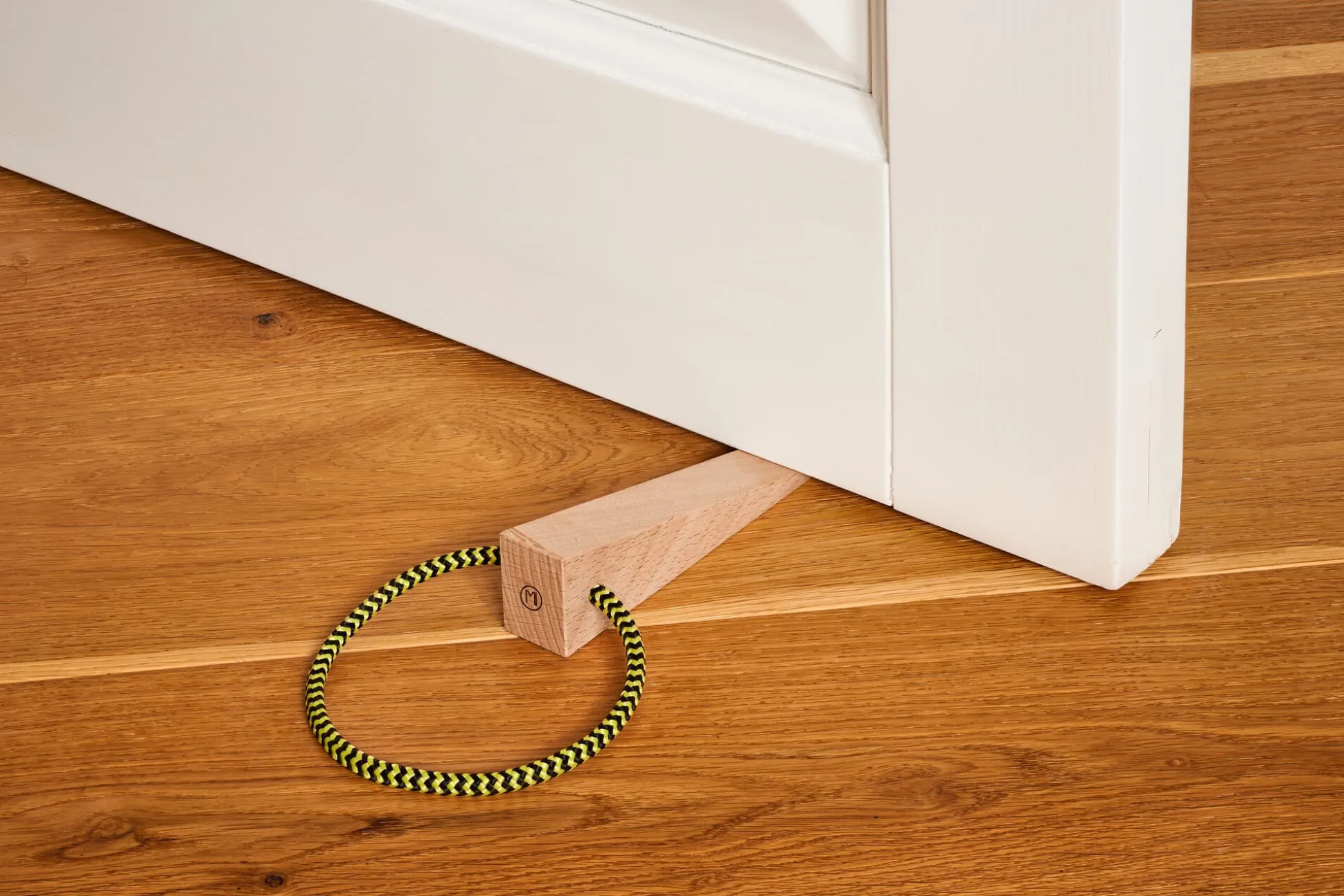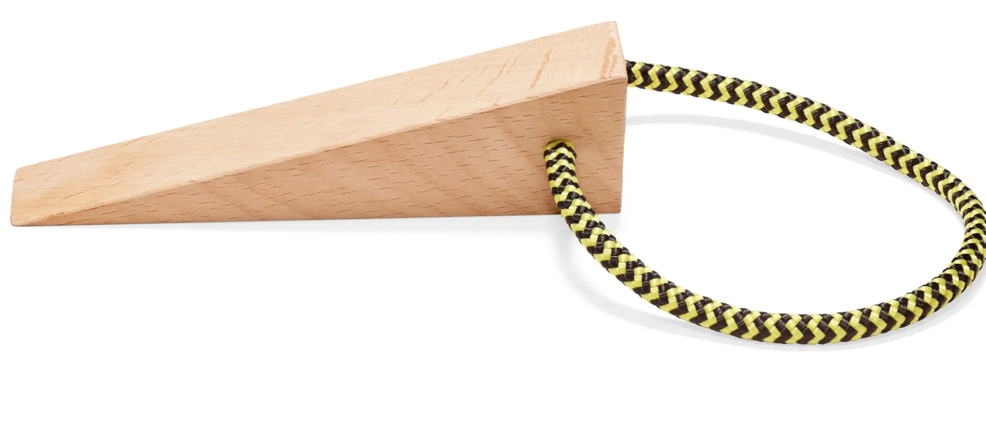 Ein Bild von einem Keil: dient verschiedenen Einsatzzwecken – für Fenster und Türen in Haus und Hof und ist mit seiner Aufhängeschlaufe schnell griffbereit. Die Holzteile sind aus massivem und in der Oberfläche roh geschliffenem Holz, mit einer Schnur aus hochbelastbarem 6-Millimeter-Polyamid.