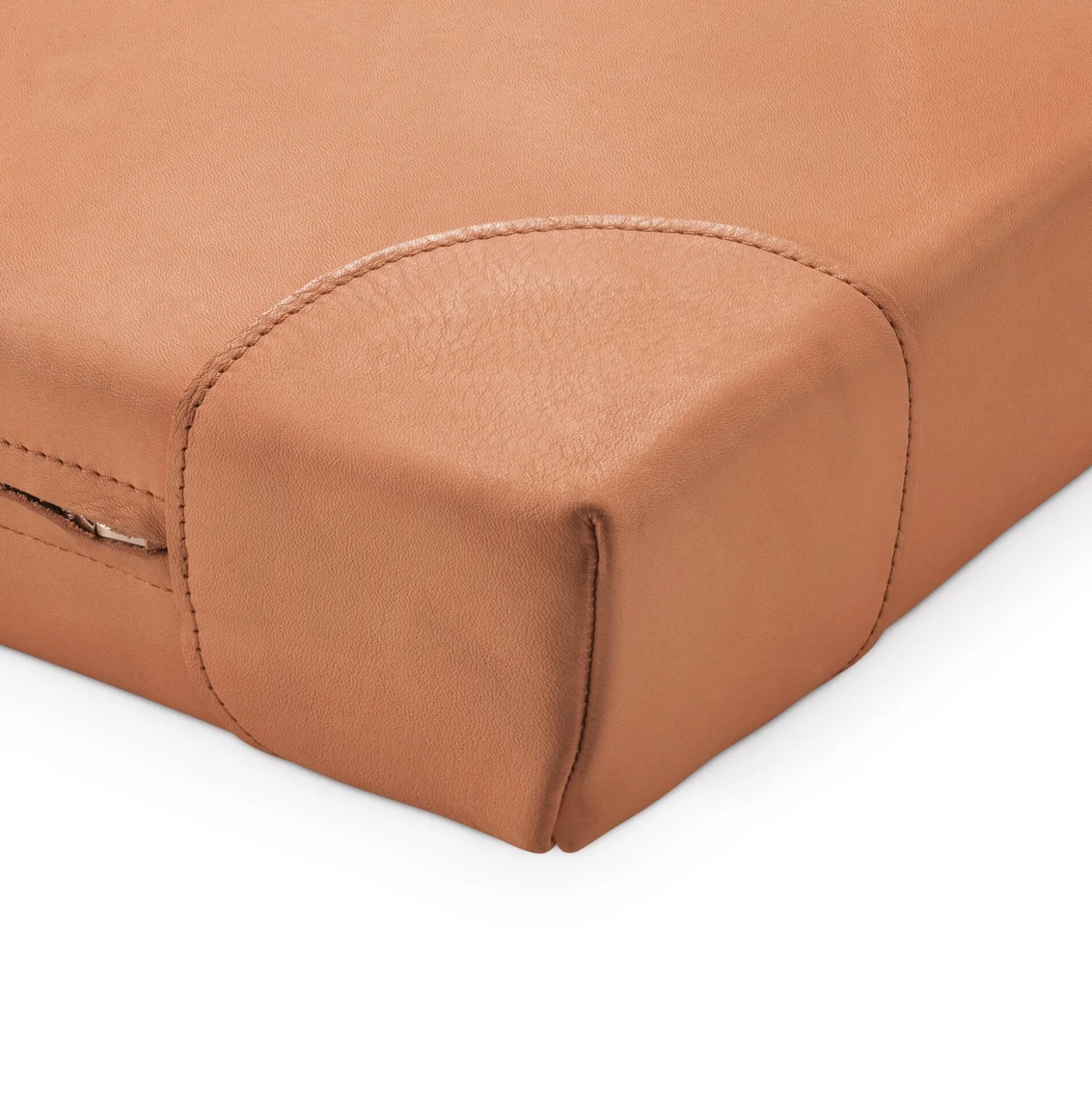 Die Ecken sind zusätzlich verstärkt, an den beiden Schmalseiten befinden sich Metallreißverschlüsse (vom Schweizer Hersteller Riri), je zwei geschraubte Ledergriffe erleichtern den Transport.