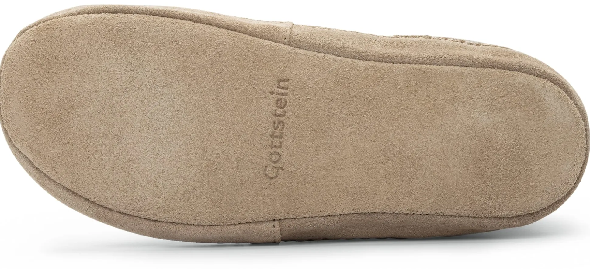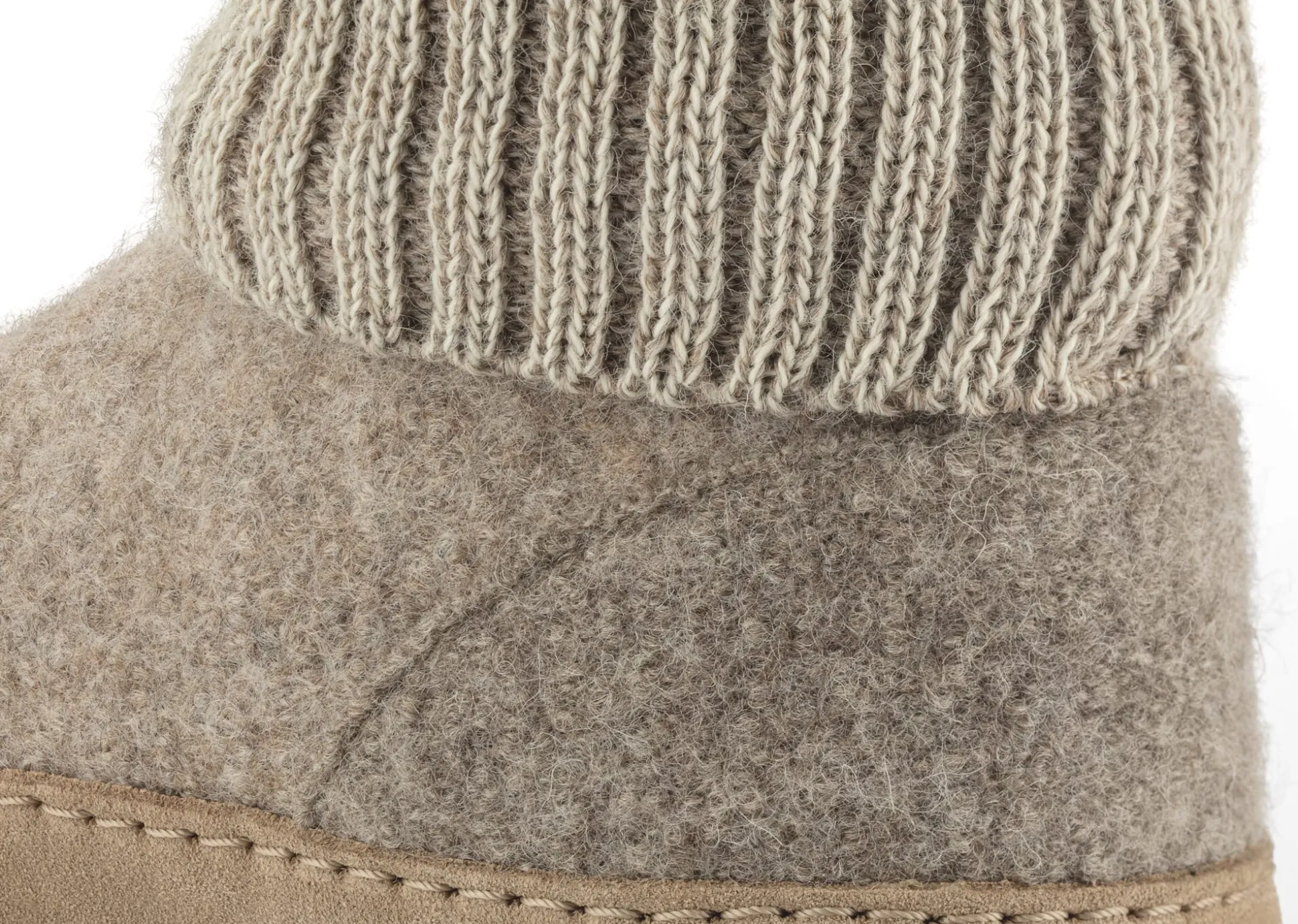 Ein weicher und wärmender Hüttenschuh, der den Fuß bis hoch zum Knöchel umschließt. Obermaterial, Futter und Decksohle sind aus Wollwalk, der aus reiner Schurwolle besteht. Der anschmiegsame und fußklimatisch günstige Wollwalk wird schuhmacherisch auf einem Leisten geformt, wodurch 1) eine optimale Passform erreicht wird und 2) praktisch kein Wollabfall entsteht. Die Stulpen in markanter Rippenstricktechnik sind umgeschlagen, was am Knöchel zusätzlich wärmt. Gottstein empfiehlt, die Stulpen vor dem Anziehen hochzuschlagen und anschließend wieder umzuklappen. Die Rauledersohle mit umlaufendem Rand schützt den Wollwalk beim Gehen, zugleich gibt sie Halt auf den meisten Untergründen.