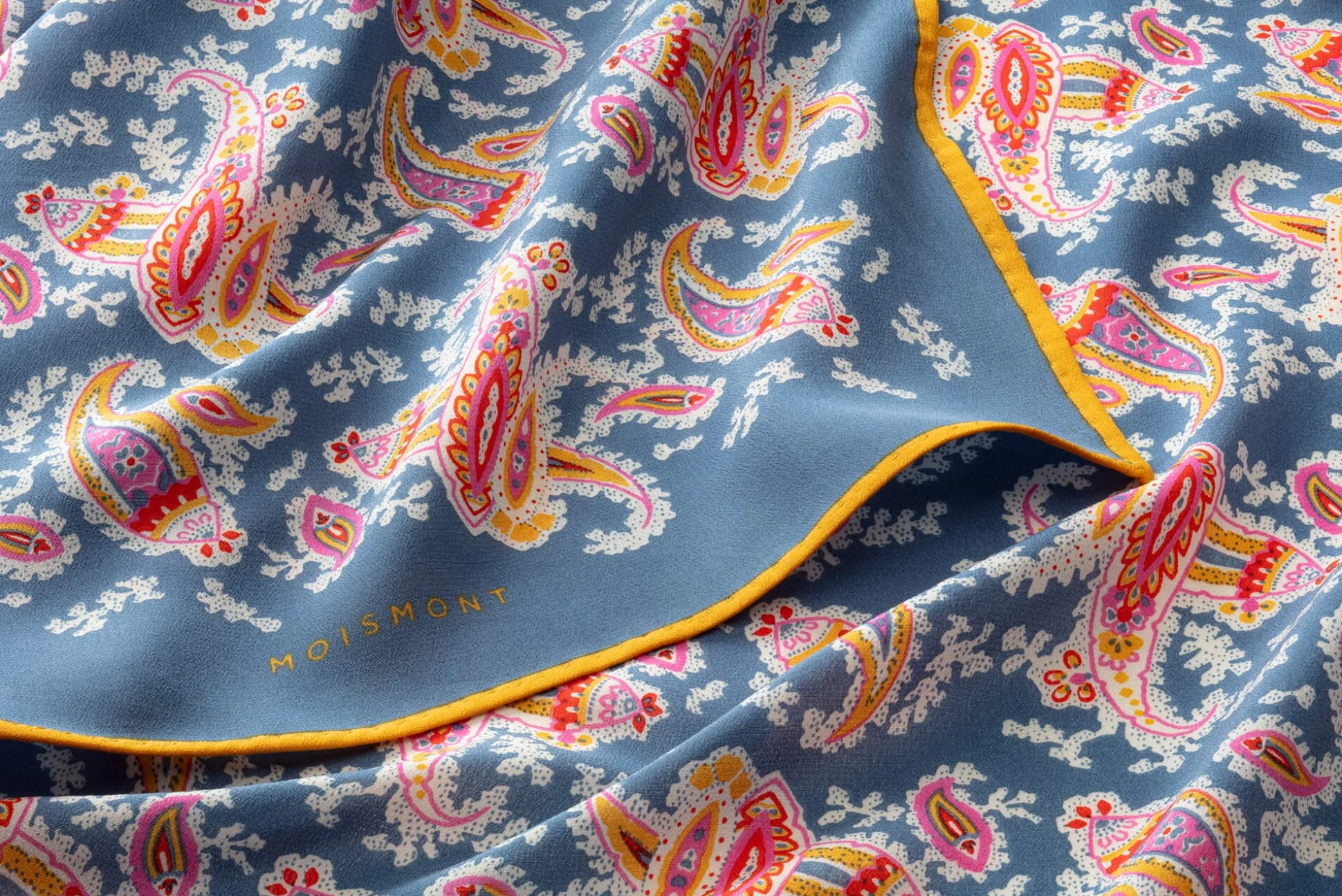 Das Paisleymuster hat seinen Namen von der gleichnamigen Stadt in Schottland, in der im 19. Jahrhundert große Mengen Textilien mit diesem Muster produziert wurden. Seinen Ursprung hat es jedoch in Persien, von wo es nach Indien kam. Dort entdeckten es wiederum die Briten und brachten es nach Europa. Moismont hat das Paisleymuster mit diesem Tuch gewissermaßen nach Indien zurückgeführt. Das handwerklich bedruckte feine Tuch besteht aus leichter, fließend fallender Seide. Seine Kanten sind gesäumt, der Moismont-Schriftzug ist farblich passend aufgedruckt.