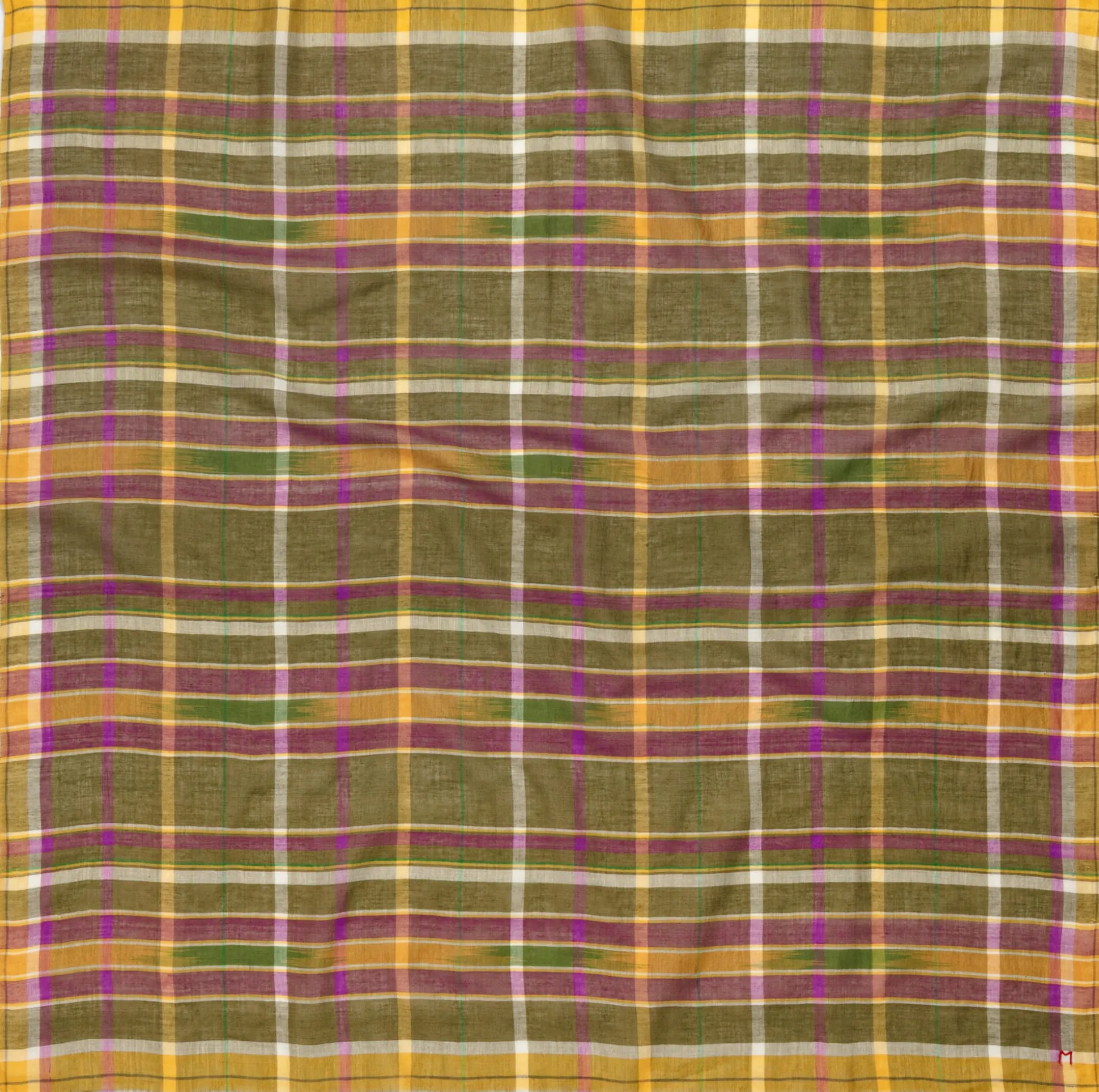 Das leichte Baumwollgewebe dieses Tuchs zeigt ein eingewebtes farbenfrohes Karomuster. Zwei Seiten des quadratischen Tuchs schließen mit Webkanten ab, die anderen beiden mit kurzen Fransenkanten. An einer Stelle ist ein farblich passendes M-Logo eingestickt.
